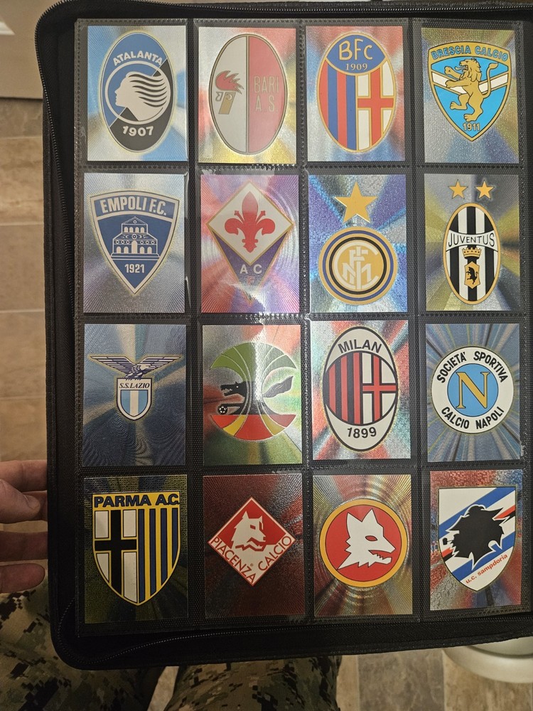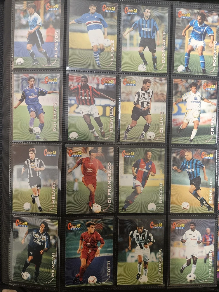 The product is a rare and vintage 1998 Panini Calcio Serie A complete set of sports trading cards in excellent condition. It includes cards featuring popular soccer players such as Ronaldo, from teams like Juventus, Inter Milan, Roma, and AC Milan. The cards are in standard size, made of paper, and are original prints licensed by Panini. This set is a valuable collector's item for fans of Italian soccer and sports trading cards from that era.