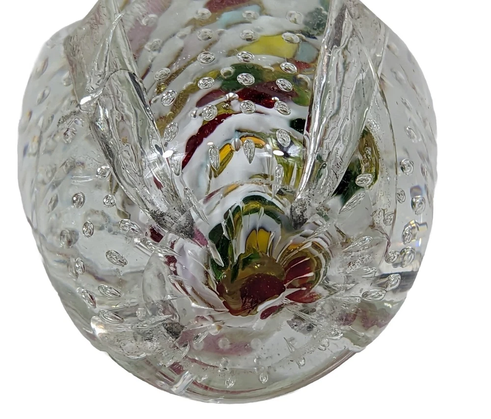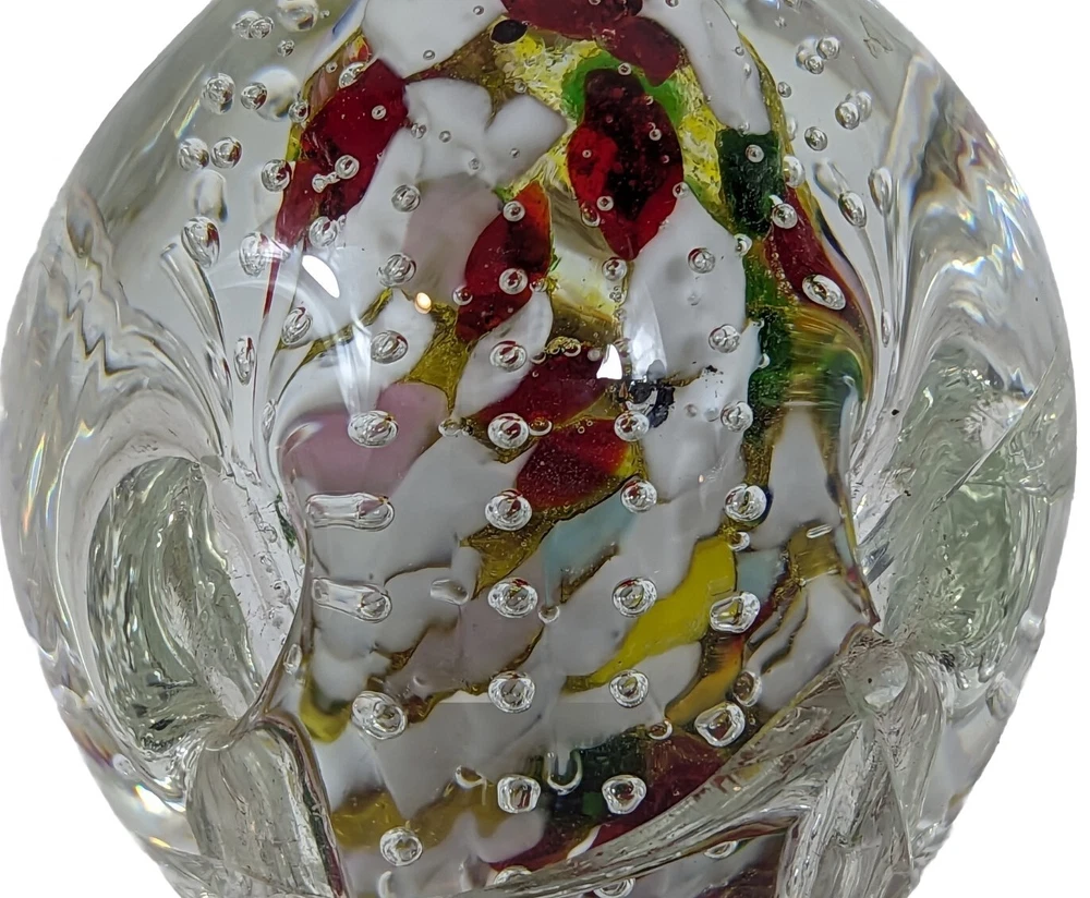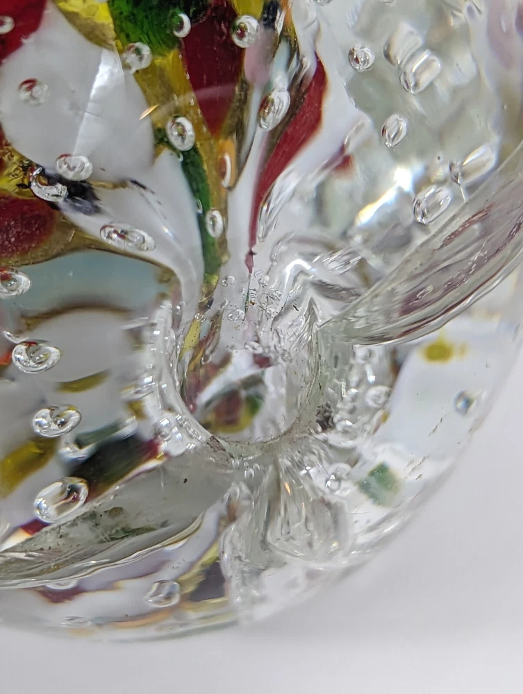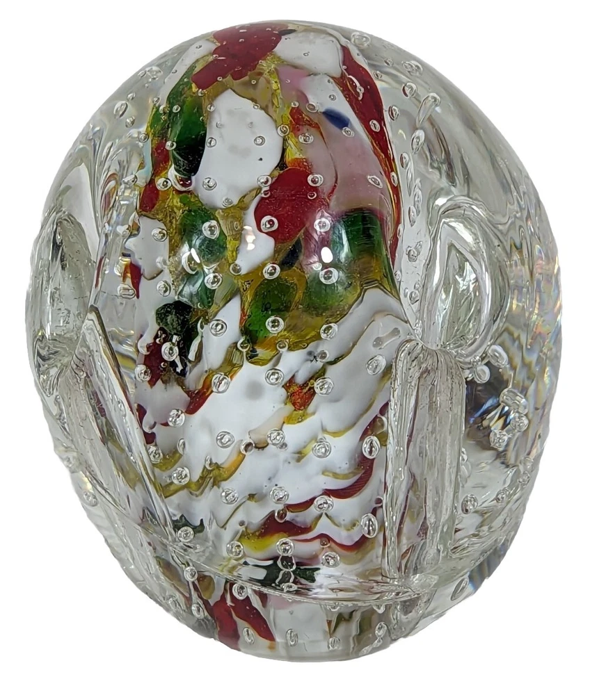 This unique paperweight features clear glass with abstract art glass bubbles and perforations. Measuring approximately 3 inches by 4 inches and weighing around 2lbs, it's a vintage piece with an unknown era. The brand is unmarked, but the production style is definitely art glass. The theme is abstract, and the color is clear. This paperweight is perfect for collectors of decorative pottery and glassware, and it would make a great addition to any collection. Has four tunnels around the circumference that go down to the base of glass but not through.