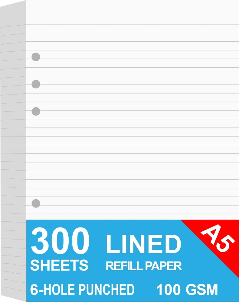 This A5 refills paper features 148 x 210mm, 6mm ruled, 32 lines, double side clear black lines, each pack 100 sheets / 200 pages, total 3 packs 300 sheets / 600 pages of high quality 100gsm white paper. 100% recycled smooth white paper for easy writing, great for a range of markers and mediums. Heavy-weight, acid-free filler paper that won't bleed through. It responds well to fountain pen, gel pen, roller pen, ballpoint pen, highlighter, pencil and etc. Standard 6 hole design refill paper works perfectly for Filofax A5 Organiser Clipbook Kikki.K (Large) Carpe Diem (A5) Foxyfix (A5) Gillio (A5) Dokibook (A5, Large) Van der Spek (Manager) Etc Loose-leaf refillable planner inserts works perfectly with binder notebook planner, ideal for bullet journaling, meeting record, class notes, travel diary, poem writing, doodles, project notebook for work, home or school. LINED PAPER INSERTS - A5 planner insert paper, 148 x 215mm, 6mm ruled, 32 lines, double side clear black lines, each pack 100 sheets / 200 pages, total 3 packs 300 sheets /600 pages filler paper STANDARD 6 HOLE - Works perfectly for Filofax A5 Organiser / Clipbook, Kikki.K (Large), Carpe Diem (A5), Foxyfix (A5), Gillio (A5) Dokibook (A5, Large), Van der Spek (Manager) etc PREMIUM PAPER - Filler paper with 100gsm smooth white paper for easy writing. Heavy-weight, acid-free paper that won't bleed through PEN TYPES FIT - Refills paper responds well to fountain pen, gel pen, roller pen, ballpoint pen, highlighter, pencil and etc IDEAL FOR- Loose-leaf refillable planner inserts works perfectly with binder notebook planner, ideal for bullet journaling, meeting record, class notes, travel diary, poem writing, doodles, project notebook for work, home or school