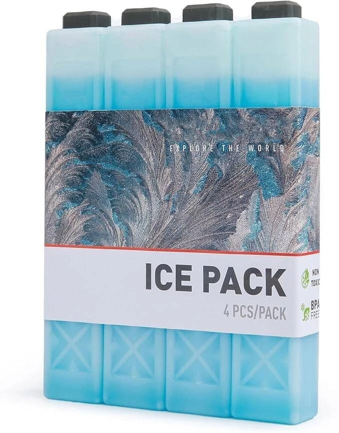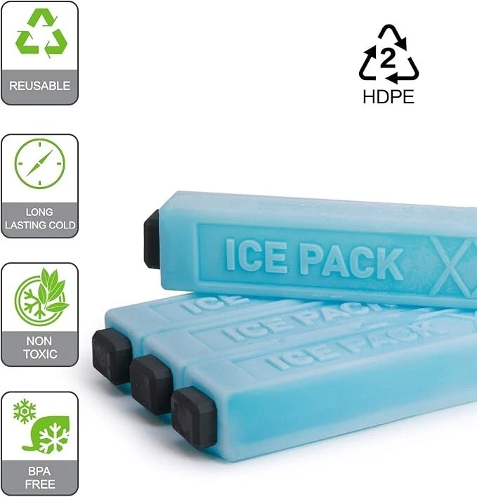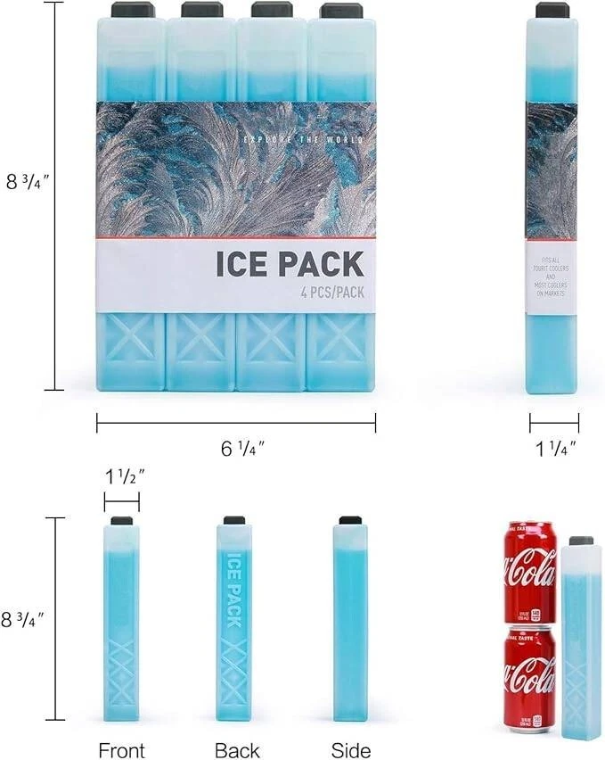 Plástico Importado Delgado y liviano: Juego de 4, 7.76 oz de peso/pieza, cada paquete de hielo de gel duro de rayas largas es reutilizable y versátil. ¡Mantenga su bolsa/mochila térmica aislada fría en el congelador por más tiempo! Seguro y duradero: Todos los materiales utilizados para hacer nuestras bolsas de hielo para bolsas de almuerzo son no tóxicos y libres de BPA. Y el paquete de hielo relleno de gel funciona mejor que el paquete de hielo convencional inyectado con agua. Mejore la frescura y la salud de su comida. Diseño único: Estos paquetes de hielo para enfriadores compactos son lo suficientemente pequeños para caber en bolsas térmicas pequeñas y medianas y hieleras o apilarlos juntos para obtener más poder de enfriamiento. Su diseño colorido hará que el tiempo que pase al aire libre sea más agradable. Instrucciones: Antes de usar, coloque los paquetes de hielo en el compartimento congelador del refrigerador durante al menos 8 horas hasta que estén completamente congelados. Guárdelos en un lugar fresco y seco, lejos de la luz solar, enfriadores perfectos para el uso diario. Manténgase fresco mientras viaja: estos paquetes de hielo mantendrán sus alimentos y bebidas fríos cuando no tenga acceso a un refrigerador.