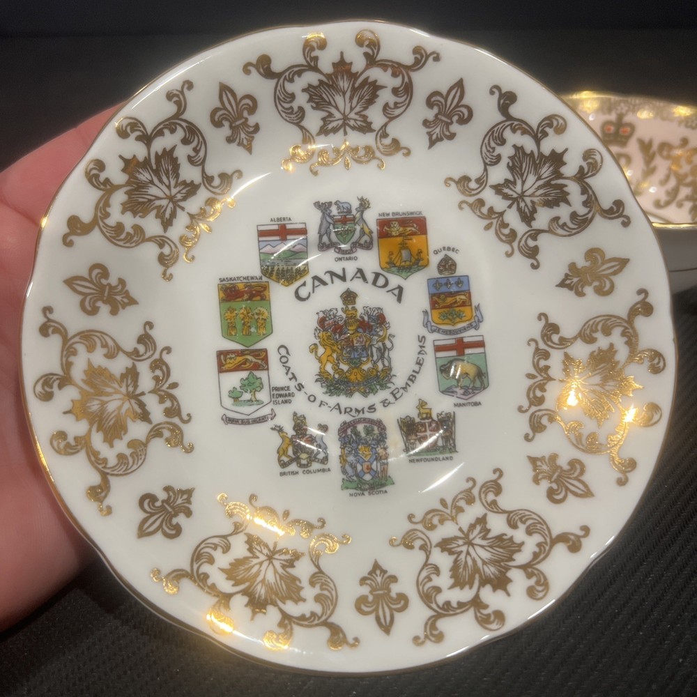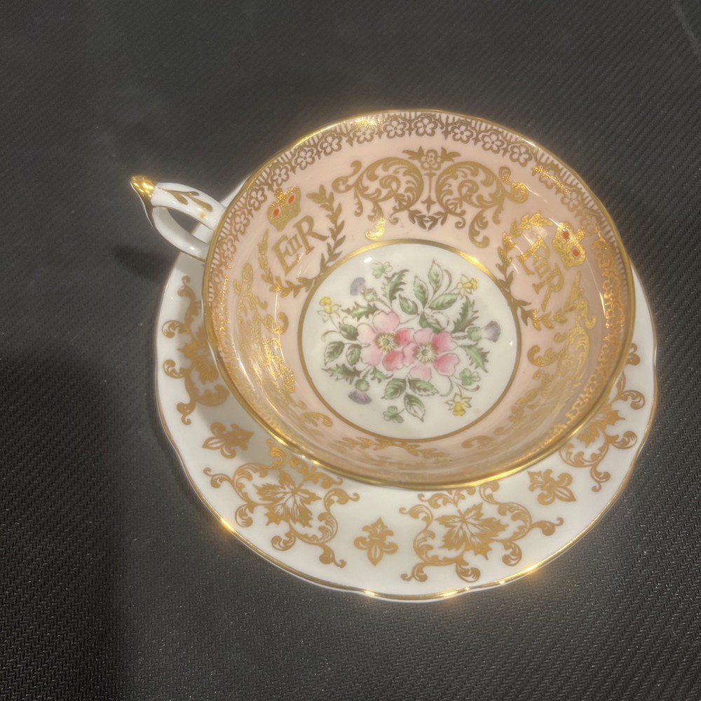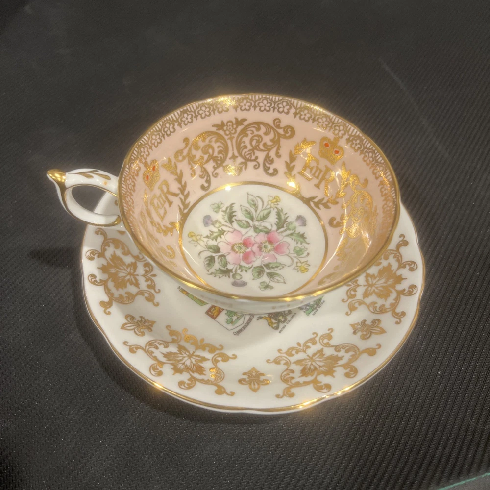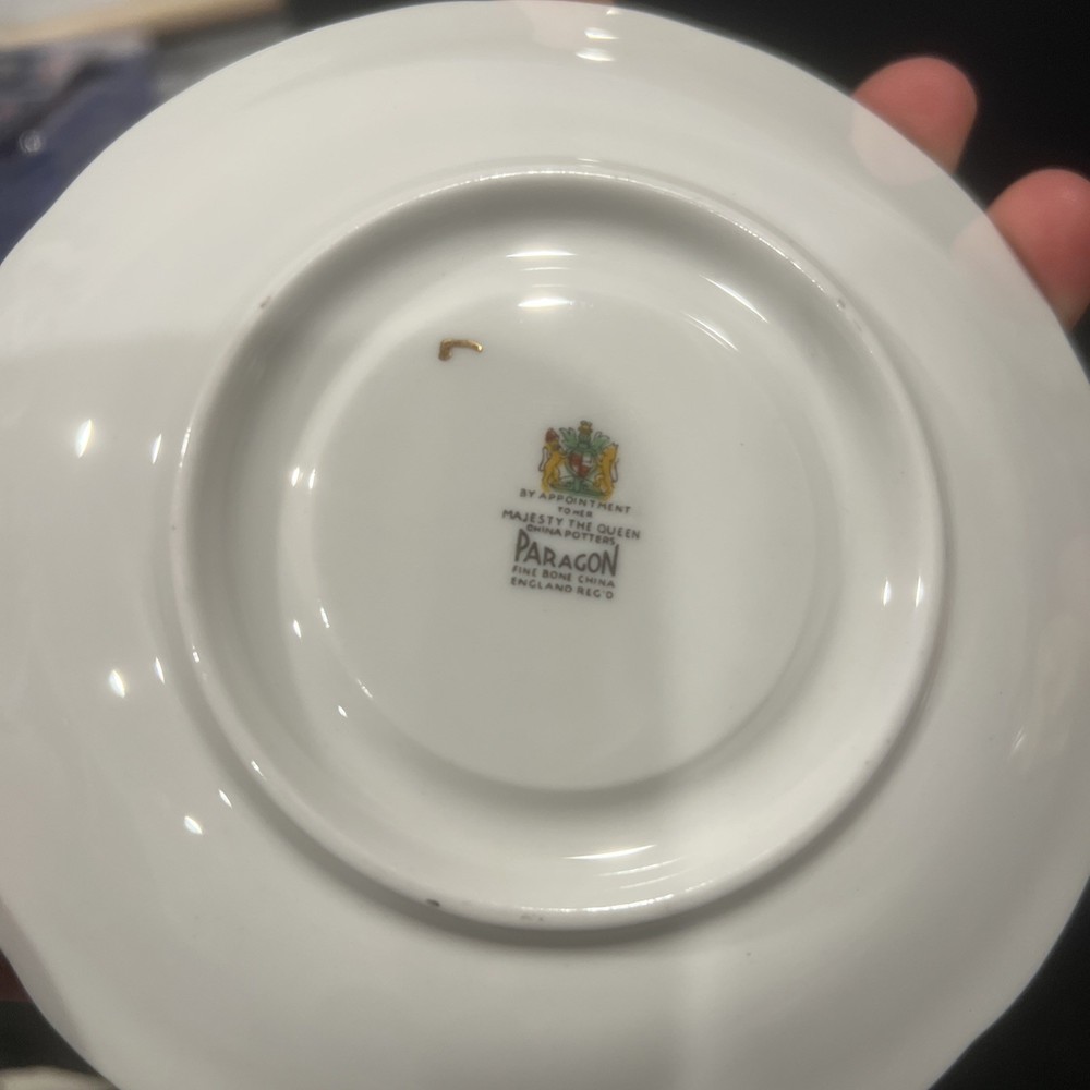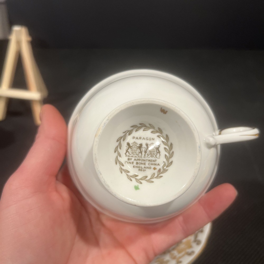 The Paragon Fine Bone China Teacup and Saucer Set is a vintage floral design with gold trim, originating from England in the 1950s. This two-piece set includes a round tea cup and saucer, featuring a beige color with a floral pattern and decorated with gold paint. Perfect for all occasions, this set is made of bone china and should be hand washed to maintain its original condition. A collectible item with a classic design, this teacup and saucer set is ideal for tea enthusiasts looking for a unique and elegant addition to their collection. Set Tea cup and saucer OBO