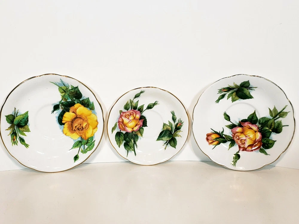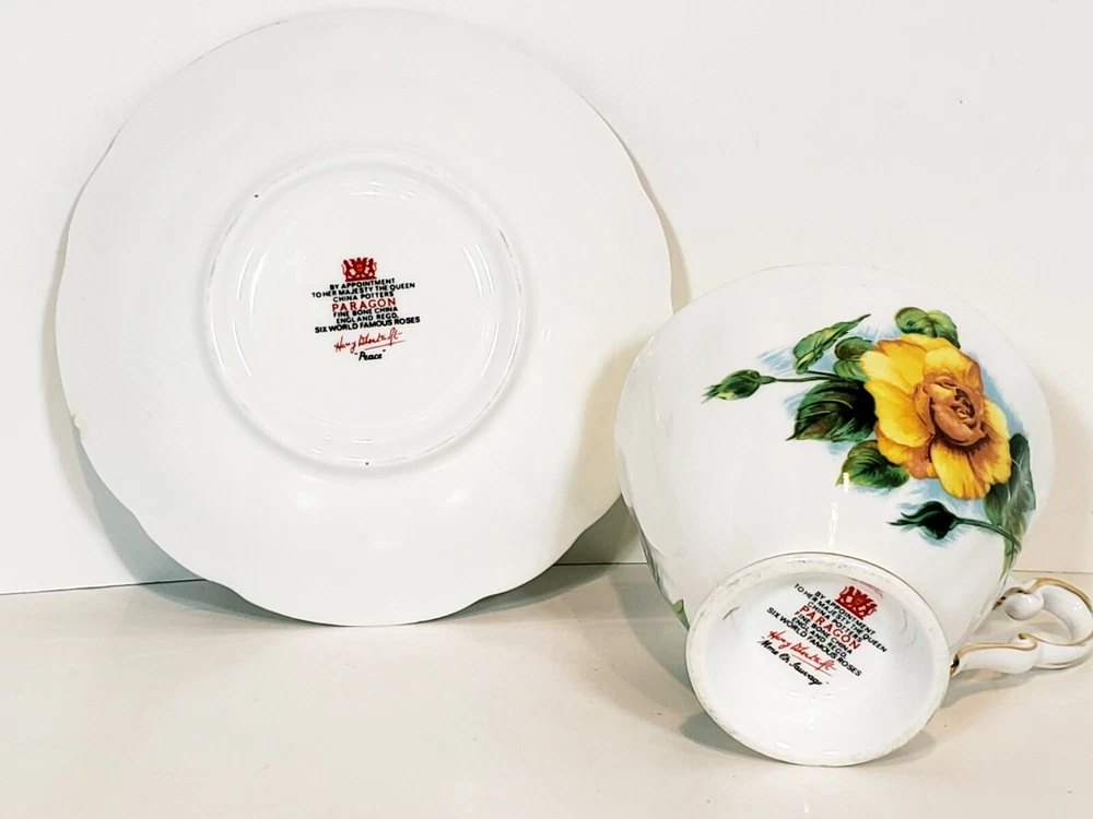 Paragon 5pcs Tea Cups & Saucers Appointment The Queen World Famous Roses. Very nice condition beautiful small mix of two patterns two peace pieces and 3 yellow rose pieces no chips or cracks some gold coloring rubbed off the top of the tea cups and one of the saucers. Two of the larger saucers measure 5 1/2" across the smaller saucer measures 4 3/4" across. Tea cups measure 3 5/16" across 3" tall