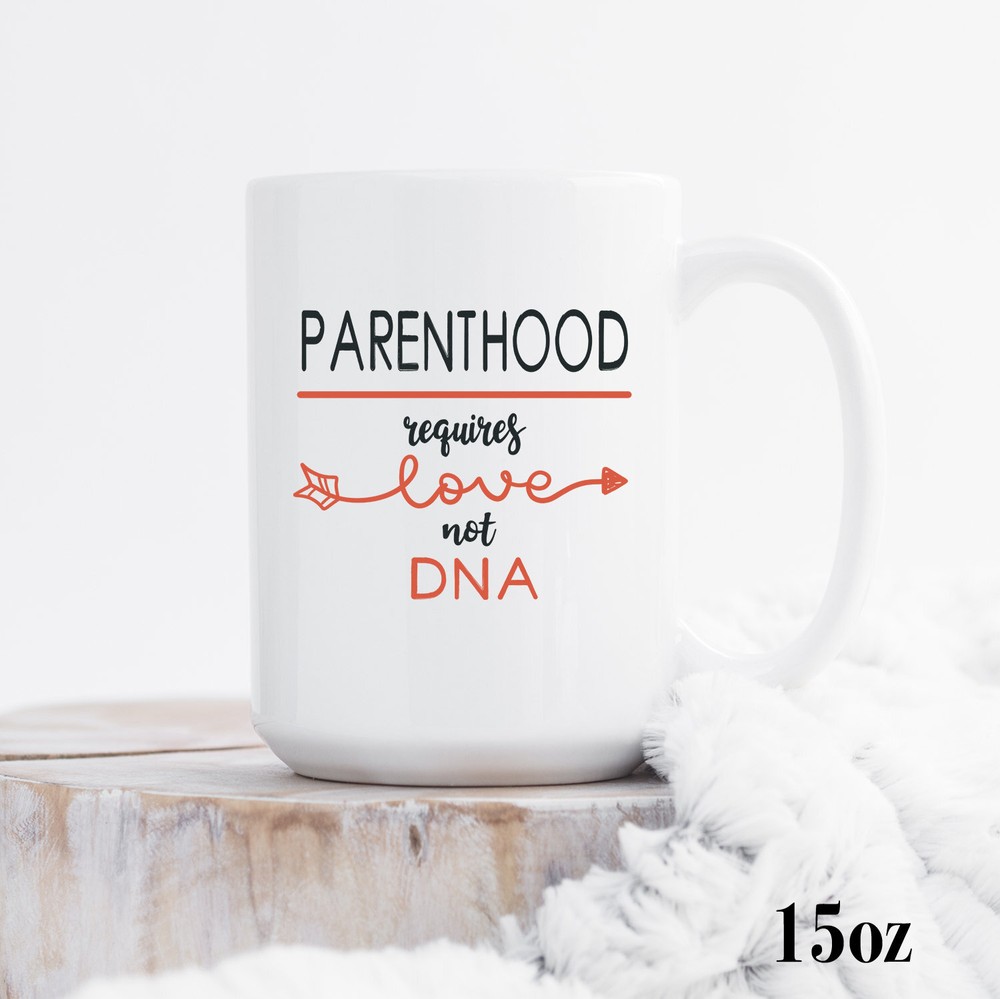 Parenthood Requires Love Not Dna Mug New Parents Mug Mom And Dad Mug Gift For Product Details.. This high quality 11oz. ceramic white mug has a premium hard coat that provides crisp and vibrant color reproduction sure to last for years. Perfect for all hot & cold beverages. The highest quality printing possible is used. It will never fade no matter how many times you wash it. Material: 100% Ceramic. Print both sides. Dishwasher and Microwave Safe. High Gloss + Premium White Finish. Printed in the U.S.A. Personalized & Custom. We support personalized and custom mug to add custom, when placing an order, you can add notes to the "order note" in shipping address section. Also you can contact us directly via message. Shipping Info. Ready to ship in 1 to 2 business days, All products are made-to-order and proudly printed in the United States. Shipped by USPS and DHL, You will receive your order in 5-7 days. Replace & Refund. All products are defective during shipping broken, chipped will be replaced free of charge. You are not satisfied with the product, we will refund 100% money to you. If any other issues arise, please do not hesitate to message, we would be more than happy to assist you.