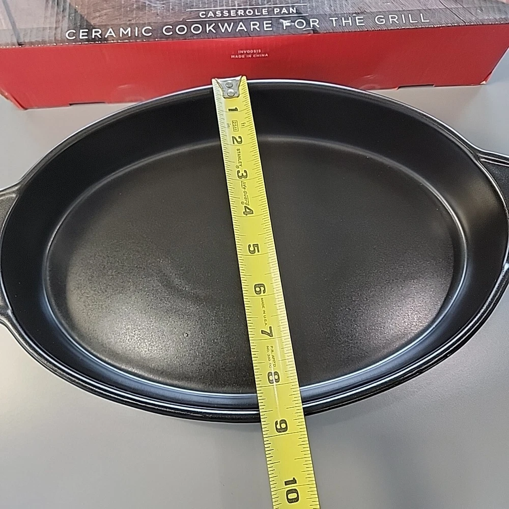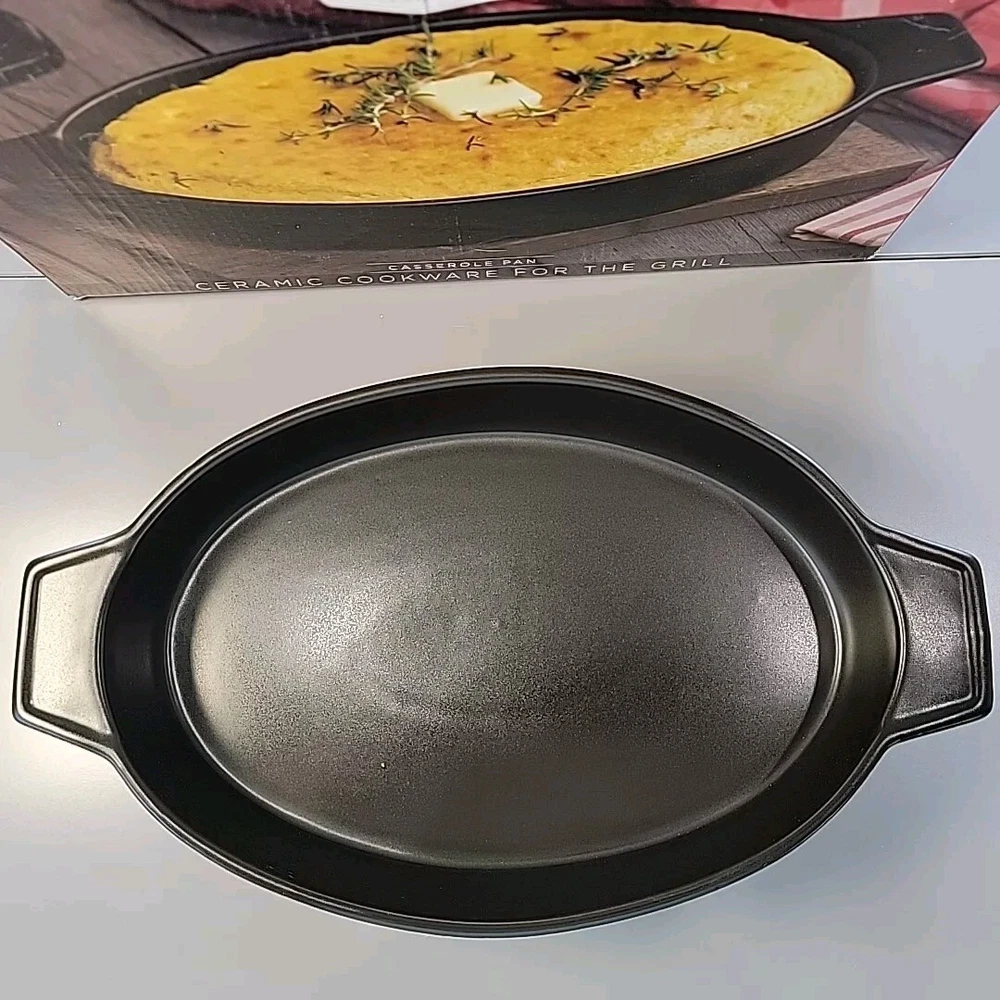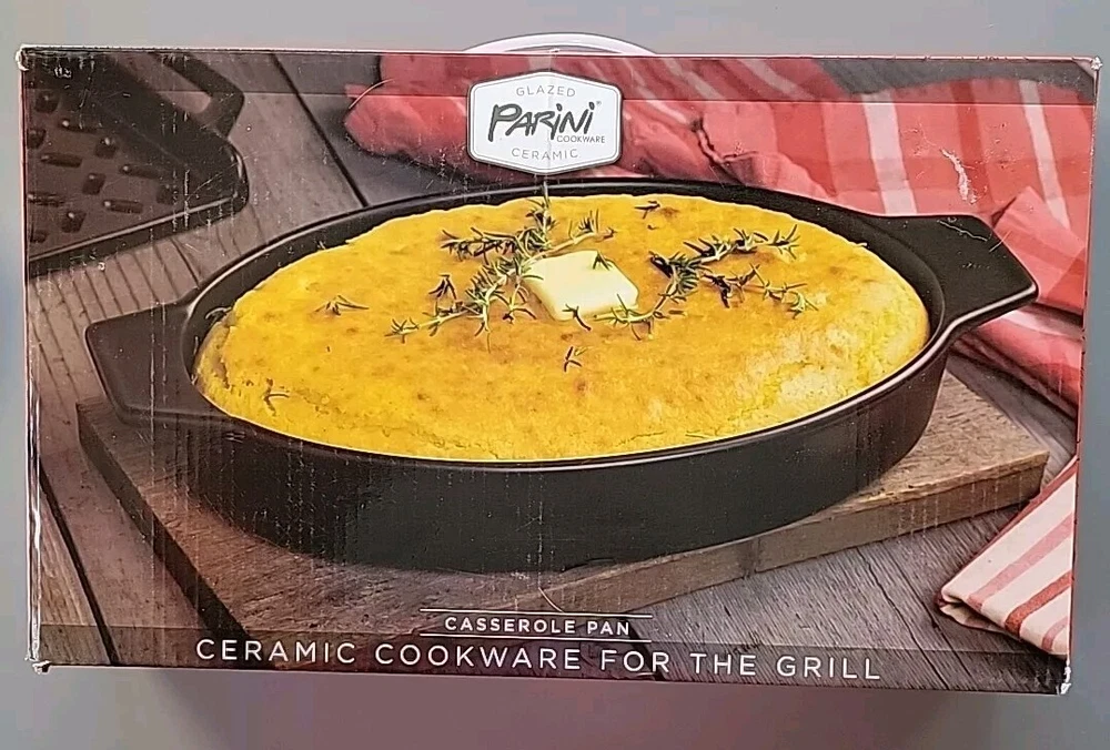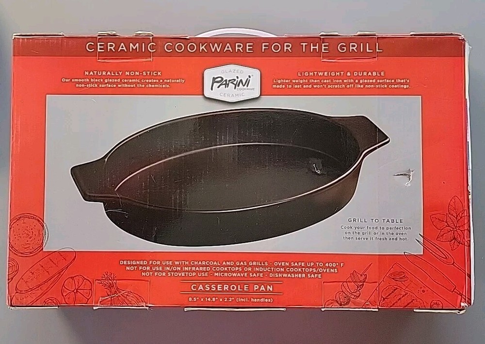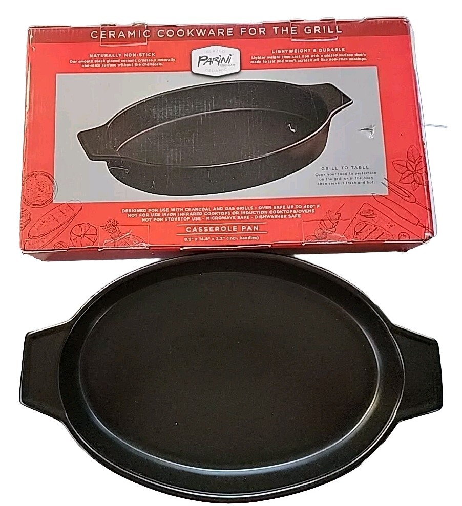 New With Open Box - Never Used. Introducing the Parini Ceramic Cookware For The Grill Casserole Pan, a high-quality addition to your kitchen. This pan is designed with a non-stick ceramic surface coating that ensures easy cooking and cleaning. The oval shape of the pan has a length of 14.5 inches, a width of 8.5 inches, and a depth of 2 inches, providing ample space for your grill casserole. The pan is compatible with all types of stoves, including electric, gas, and microwave ovens, with a heat resistance of up to 400°. It features a flat-bottomed design with double handles that make it easy to carry and dishwasher safe. The set includes one casserole pan, and it is made of high-quality ceramic material. Get ready to cook delicious grill casseroles with this Parini Ceramic Cookware for the Grill Casserole Pan!