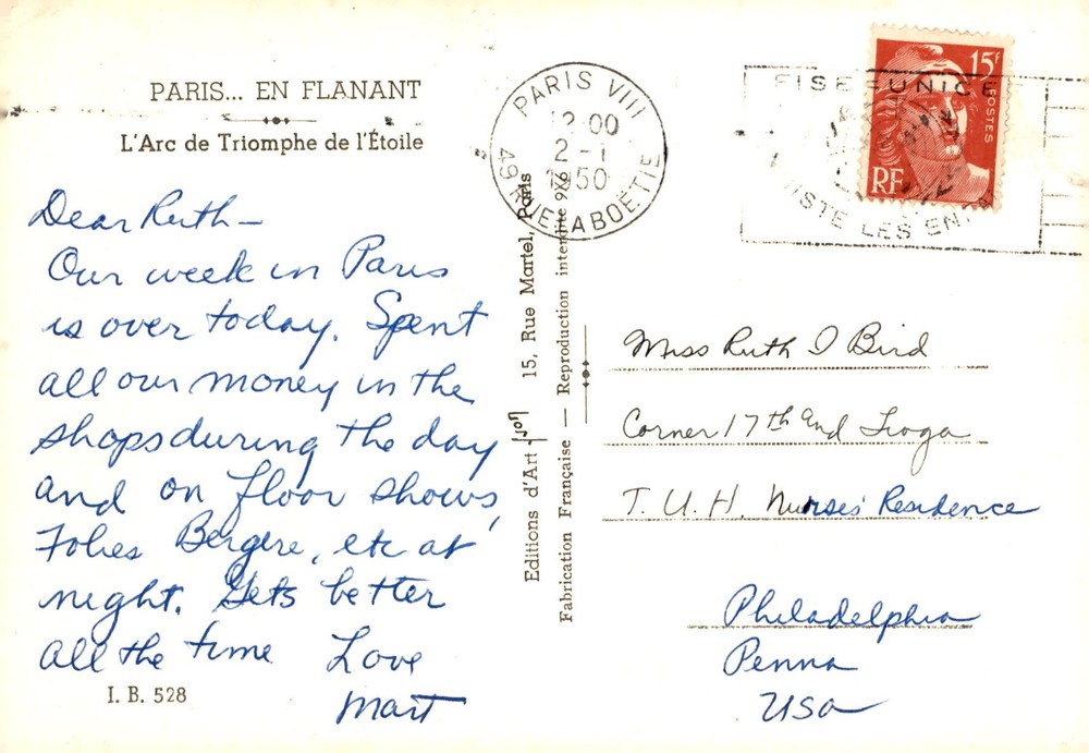 Week in Paris over, spent money in shops during day and on shows at night. Love, I. B.