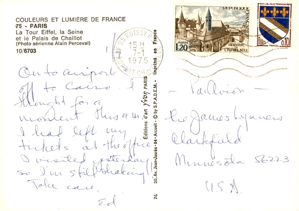 Aerial photo featuring iconic landmarks of Paris - the Eiffel Tower, the Seine River, and the Chaillot Palace. Postmarked from Roissy in 1975, with a message about a memorable visit to France.