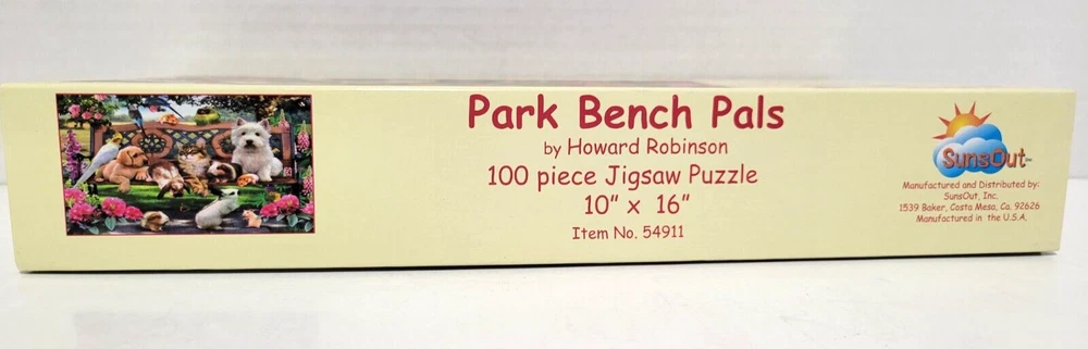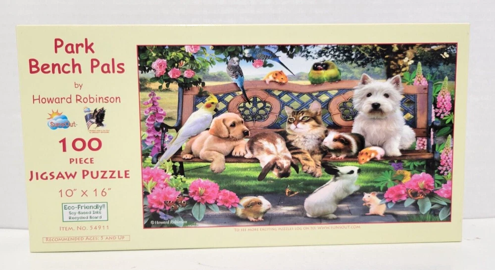 Park Bench Pals by Howard Robinson 100 Piece Jigsaw Puzzle 10"x16" Baby Animals This puzzle is very fun to put together and the many animals are very cute. COMPLETE, see pic. Each item is carefully packaged to prevent any damage and is shipped immediately with tracking.