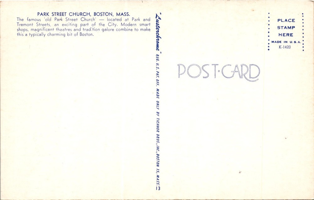 The postcard features an image of the old Park Street Church in Boston, Massachusetts, located at the intersection of Park and Tremont Streets. The church is a famous landmark in Boston and is known for its historical significance.