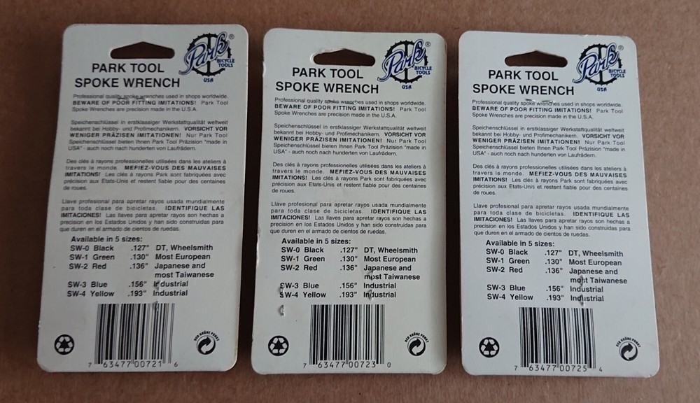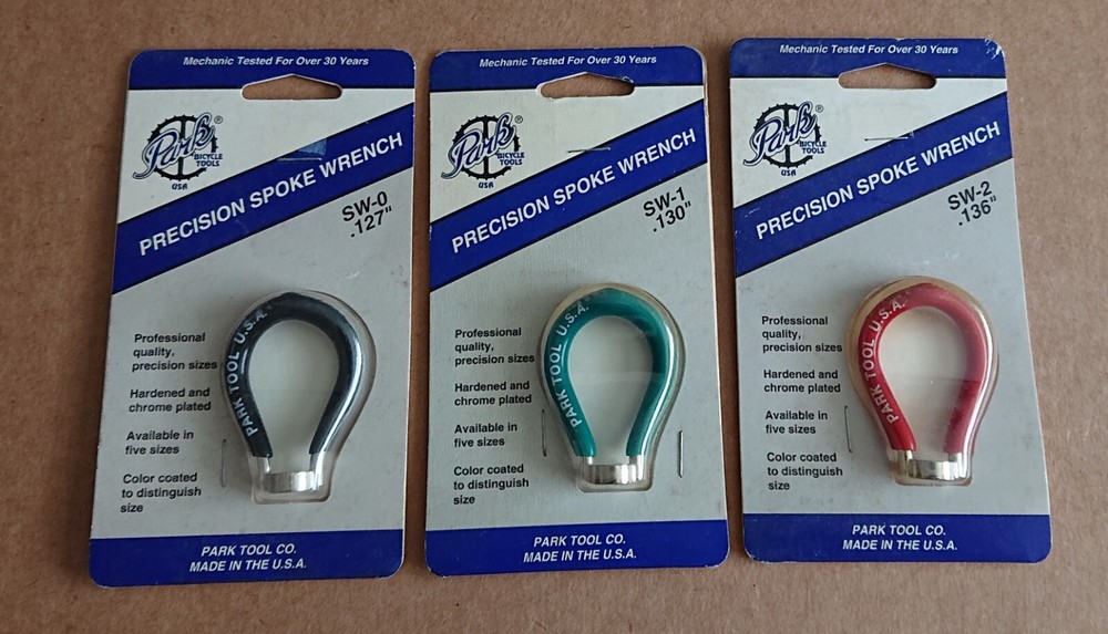 Park Tool SW-0 Spoke Wrench Black.. Fits Bicycle Spoke Nipples With 3.23 mm (0.127") Wrench Flats.. Park Says Fits DT And Wheelsmith.. Park Tool SW-1 Spoke Wrench Green.. Fits Bicycle Spoke Nipples With 3.30 mm (0.130") Wrench Flats.. Park Says Fits Most European.. Park Tool SW-2 Spoke Wrench Red.. Fits Bicycle Spoke Nipples With 3.45 mm (0.136") Wrench Flats.. Park Says Fits Japanese And Most Taiwanese.. Set Of 3 Park Bicycle Spoke Wrenches.. Made In The USA.. Please Ask Any Questions.. Thanks And Cheers 🙂 Yes I Will Gladly Ship Multiple Items When Shipped At The Same Time.. I Will Refund Excess Shipping.. P.S. FYI Will Be Listing 100s If Not 1000s Of NOS And Also Used Items In Next Few Days, Weeks & Months