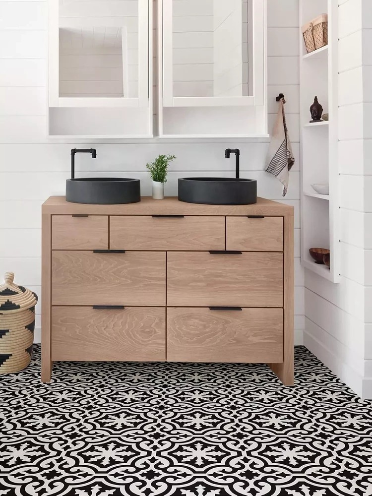 Farmhouse inspired black and white peel and stick floor tile Peel and stick to apply Easy installation - no grout or special tools needed Water resistant and washable Virgin Vinyl material with a textured low lustre finish and permanent adhesive makes tiles durable One package contains 10 tiles that each measure .06-in in depth