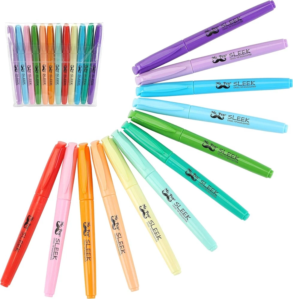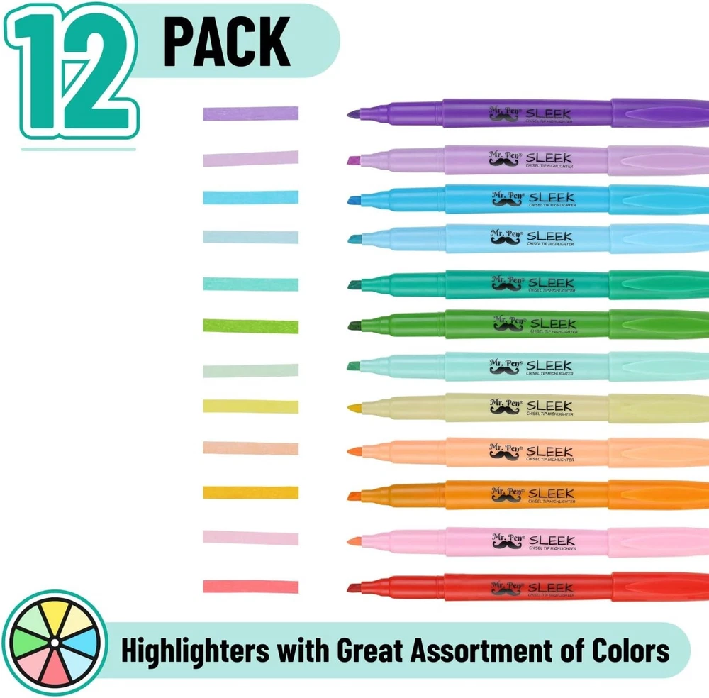 Pastel Highlighters , 12 Pack , Assorted Colors , Fast Dry , Highlighter Pastel , Set , Bible Journaling Highlighter , Marker , Colored School Supplies Ink Color Multicolor Number of Items 12 Point Type Chisel Recommended Uses For Product Writing About this item Mr. Pen Highlighter Pack Includes 12 Pastel Color Highlighters In Assorted Colors Multi-Purpose Chisel Tip Highlighters, Great For Highlighting, Underlining Or Writing Notes Quick Dry, Odorless And Non-Toxic Ink Highlighters Resist Smearing Of Many Pens And Marker Inks (Let Ink Dry Before Highlighting) Premium Highlighters Great For Highlighting And Emphasizing Words And Sentences At School, Home, Or Office
