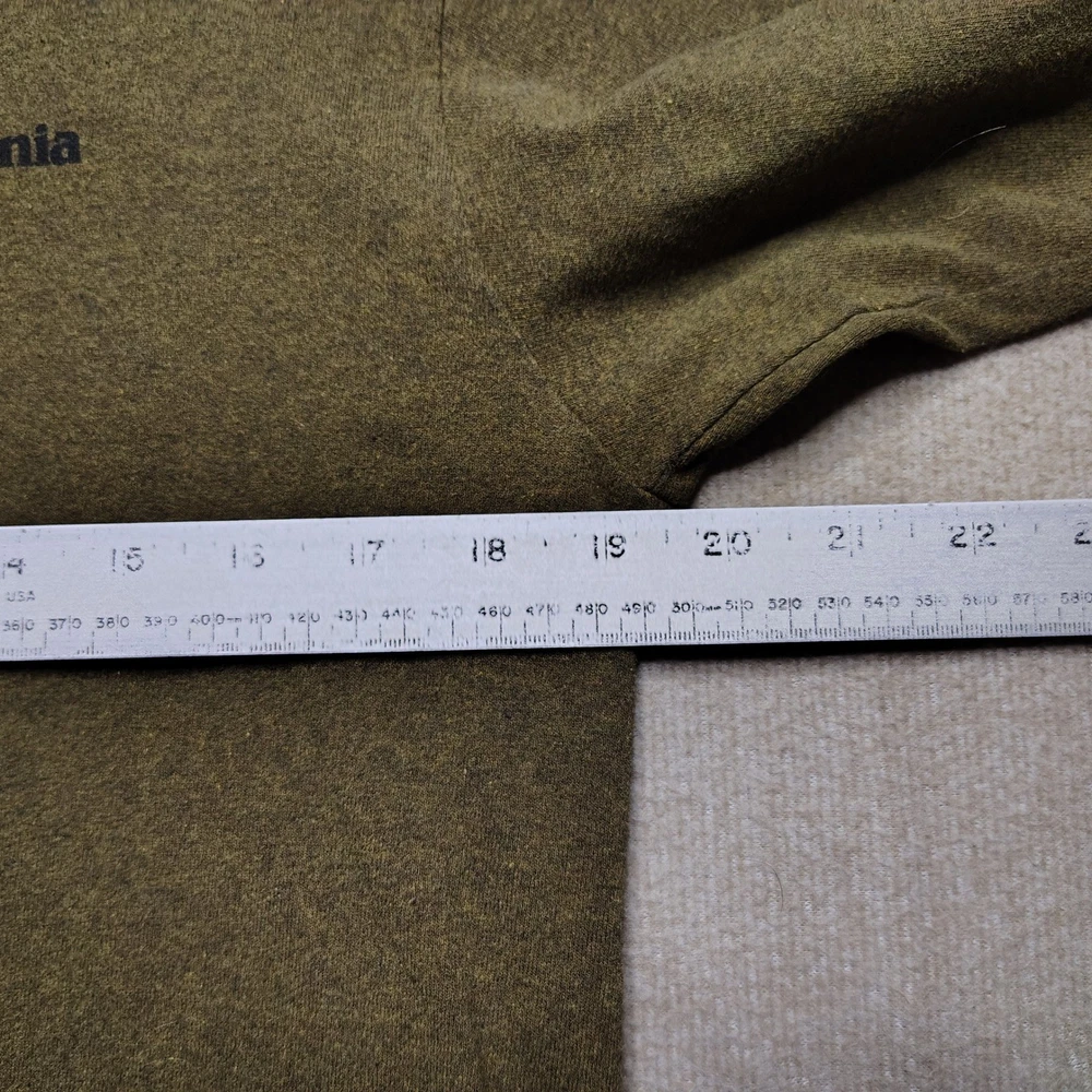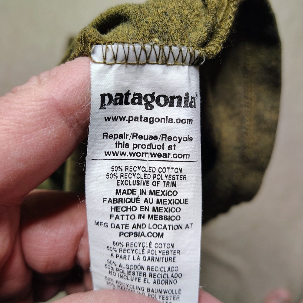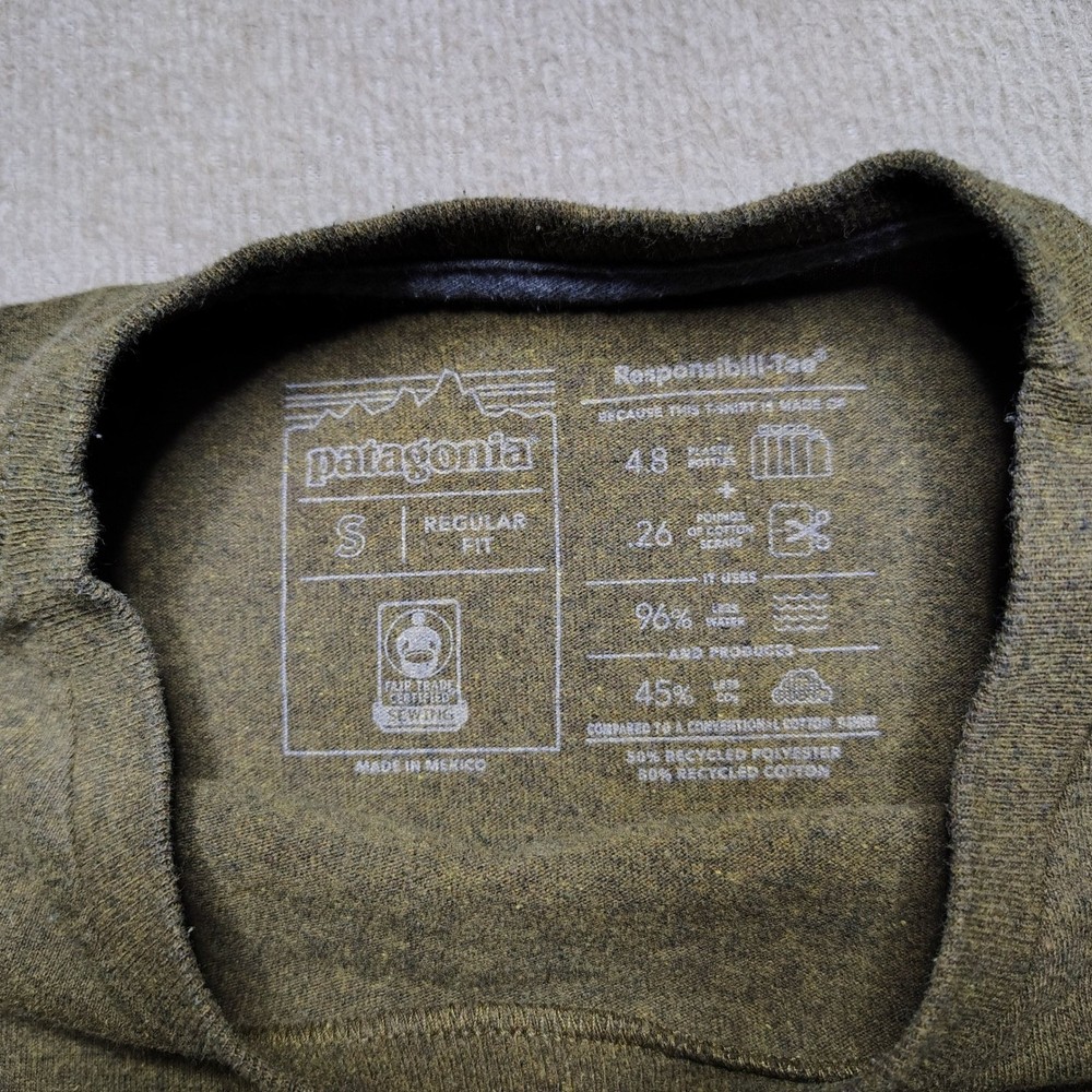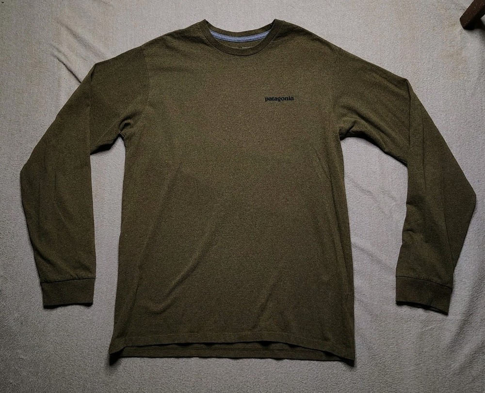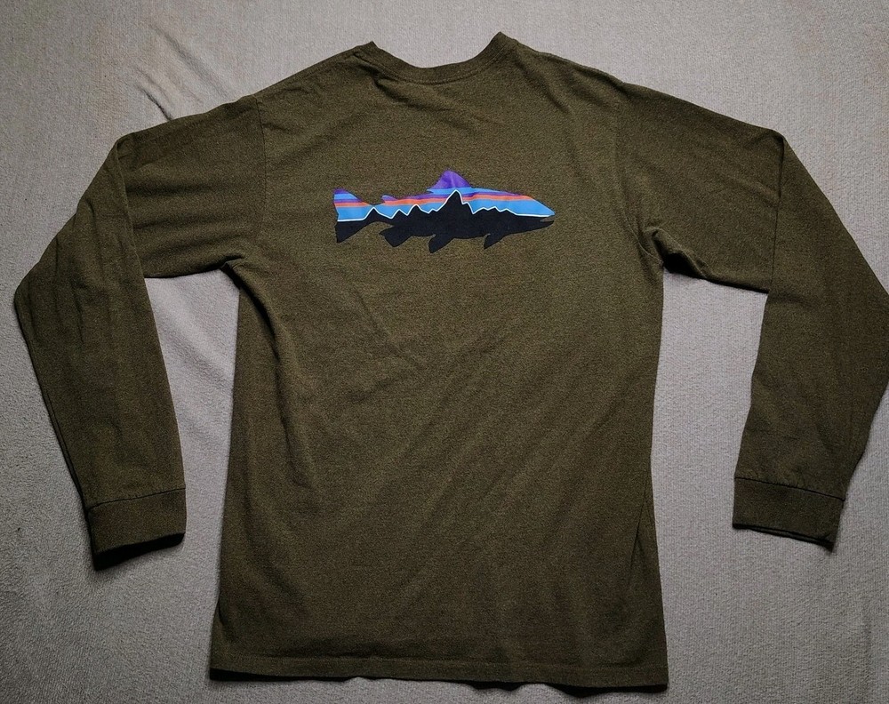 In good condition with no rips/stains/holes. Men's size small. Measurements: • Chest: 19.5 in • Length: 26.5 in • Sleeve Length: 25 in Patagonia long sleeve t-shirt in a regular fit. Features a small Patagonia logo on the chest and a graphic print of a fish with a mountain landscape on the back. This shirt is made from a blend of recycled cotton and recycled polyester. Department: Unisex Adults Theme: Fish Fit: Regular Sleeve Length: Long Sleeve Pattern: Graphic Print Type: T-Shirt Features: Preshrunk, Lightweight Neckline: Crew Neck Fabric Type: Jersey Material: Cotton Blend, Polyester Accents: Logo Season: Spring, Fall Model: Sportsman Keywords: Patagonia tee, outdoor adventure, fishing graphic, recycled materials, crew neck, casual wear, everyday shirt, outdoorsy, nature inspired, eco friendly, comfortable fit, long sleeve top