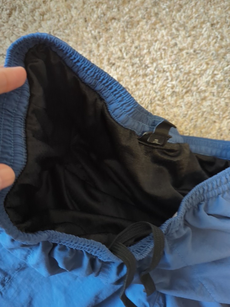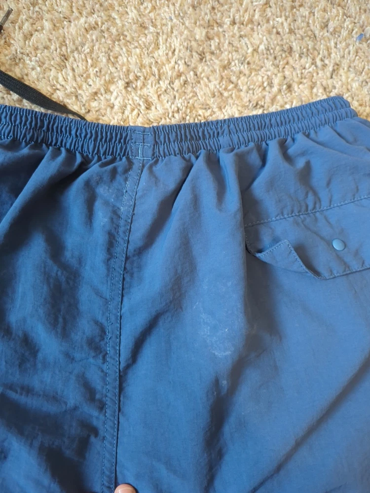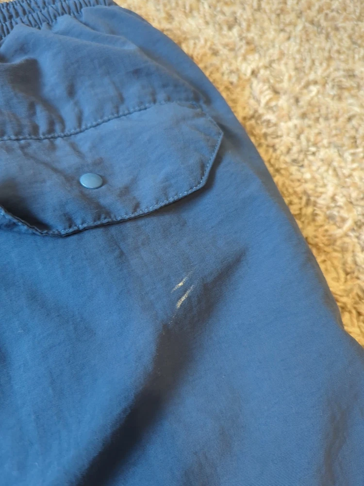 There are a few area of light discoloration on back of trunks as shown in photos. no rips or holes. drawstring works well.