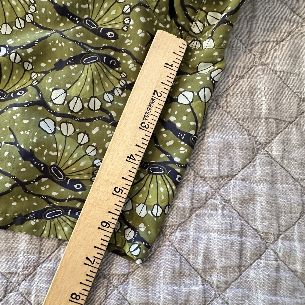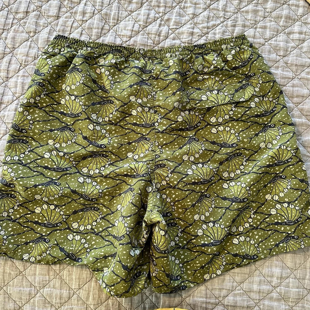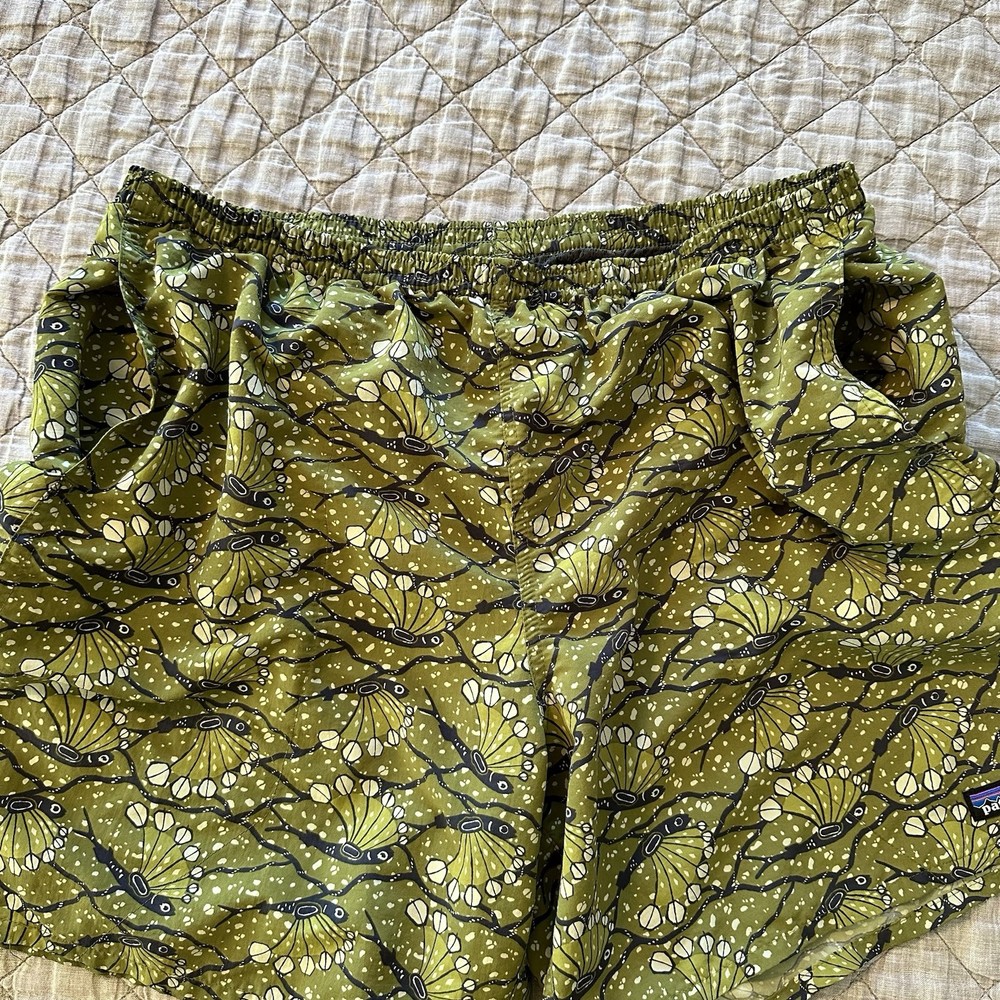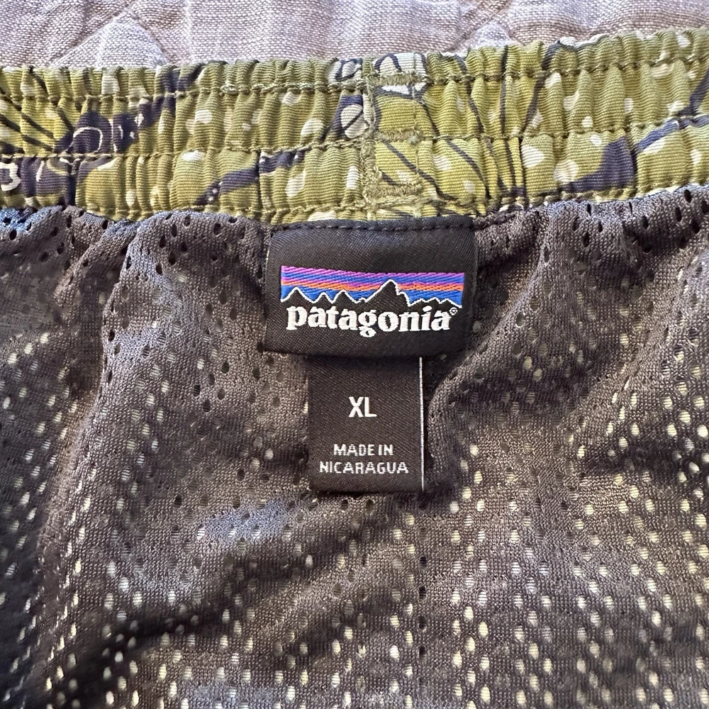 Patagonia men’s Baggies-style shorts featuring a green allover bird print with elastic waistband and mesh liner. Lightweight, quick-dry design suitable for swim, beach, hiking, travel, or casual wear. Classic Patagonia quality with logo patch at hem and snap back pocket. Condition: Very good pre-owned condition. No holes or stains noted. Elastic remains strong and liner intact. Size: Men’s XL (Flat measurements shown in photos for best fit comparison) Features: • Elastic waistband with drawstring • Mesh liner • Lightweight quick-dry fabric • Back snap pocket • Patagonia logo patch • Made in Nicaragua