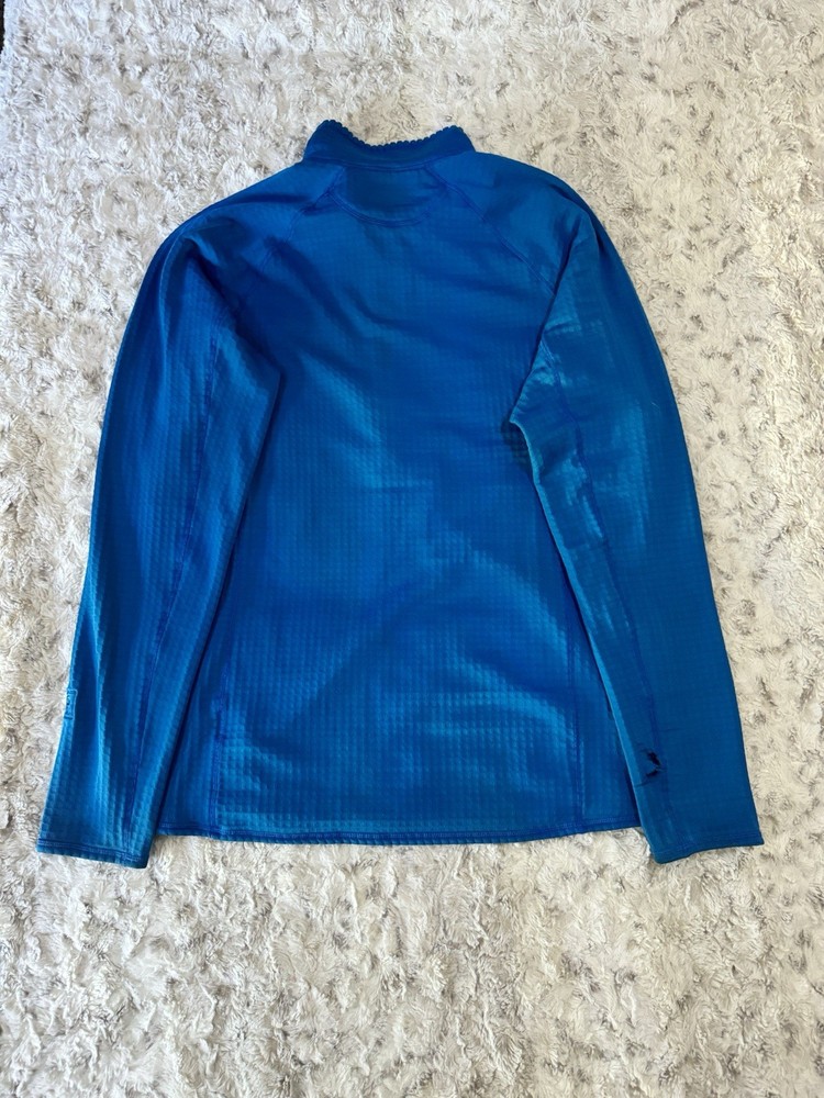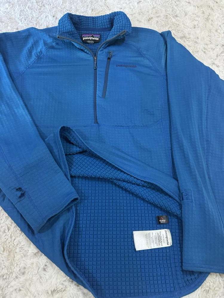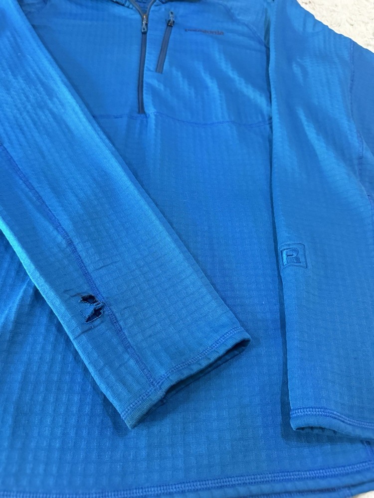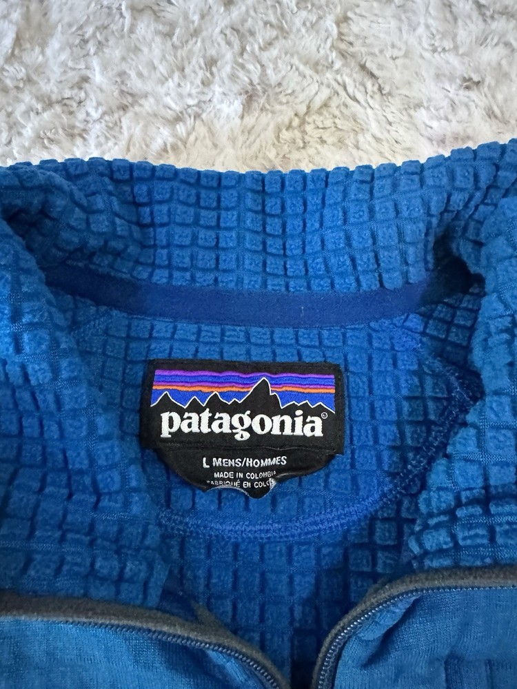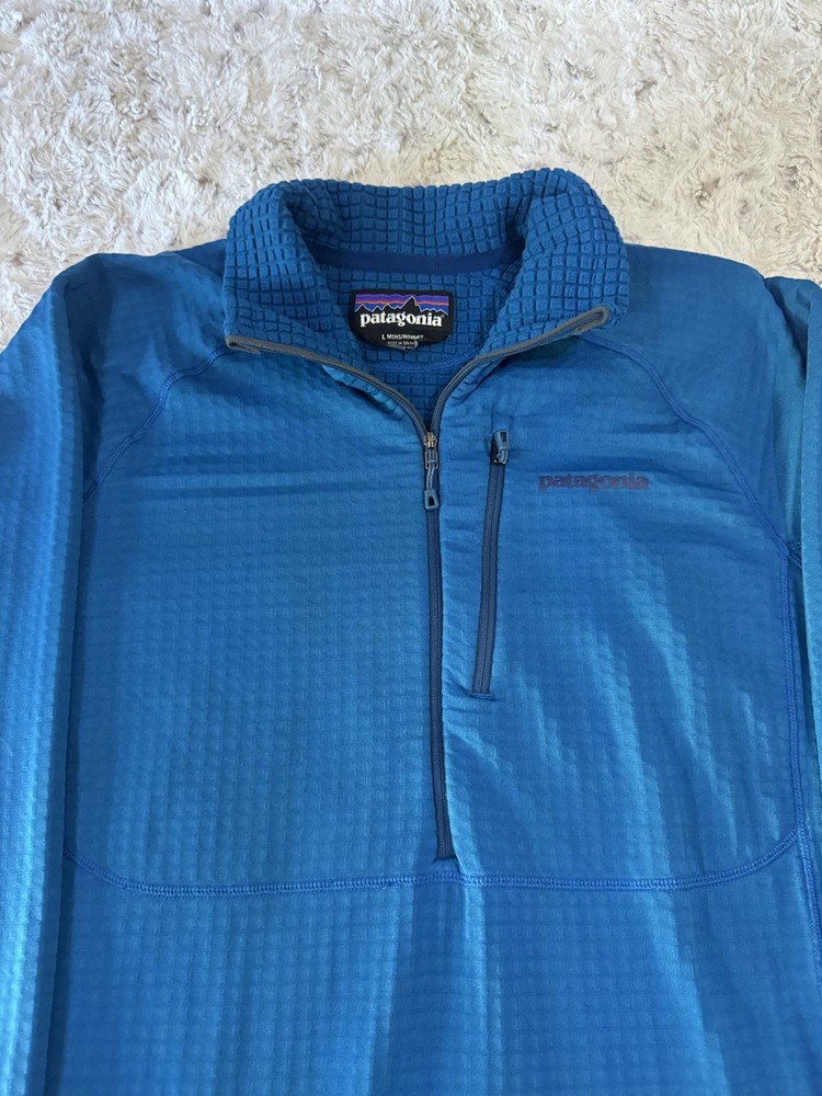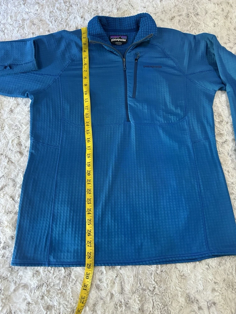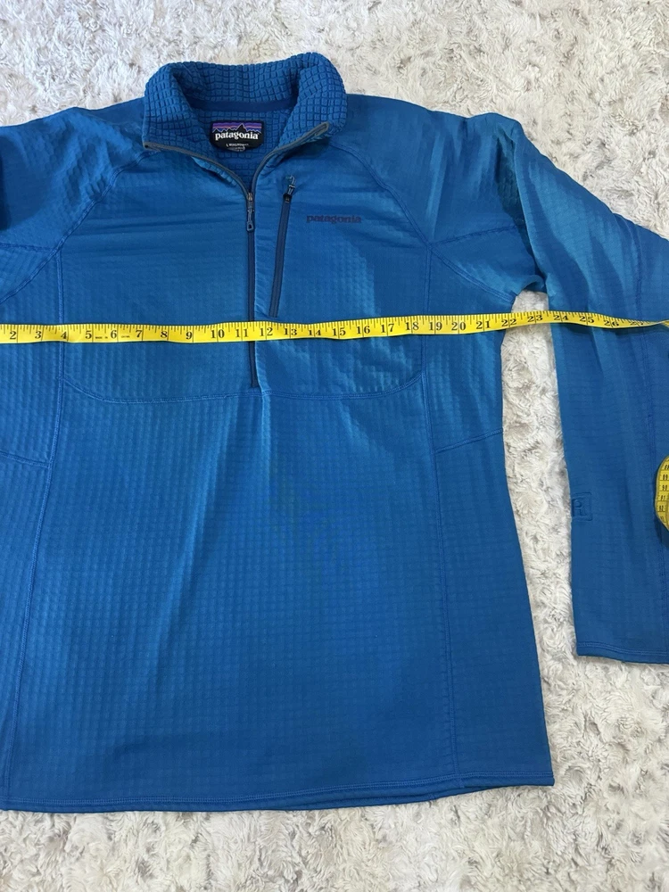 Patagonia R1 3/4 Zip Pullover jacket. Jewel Blue color. Size Large. Good condition. *hole on the sleeve* see photos for details and measurements. message with any questions.