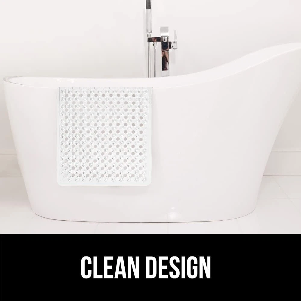 Patented Bathmat, 35x16, Clear, Bathtub Shower Mat, Plastic, Hexagon, Soft on Feet, Machine Washable, Suction Cups, Drainage Holes, BPA Free, Long Bath Tub Floor Mats PATENTED DESIGN WITH POWERFUL SUCTION GRIP: a bathmat designed to securely stay in place; the patented mat features hundreds of suction cups that effectively help secure the mat to your tub or shower floor EASY WATER DRAINAGE: hundreds of drainage holes allow for water to easily flow under the mat and towards the drain, helping to prevent water from sitting stagnant under the mat in your tub TEXTURED AND BPA-FREE: the mat is constructed from BPA free materials; it features a unique hexagon design with a pebble textured topside that is soft on feet; bathmat is soft, flexible, and perfect for the whole family OVERSIZED AND MACHINE WASHABLE: the bathmat is so easy to clean, simply machine wash and air dry; you can easily air dry the bathmat by hanging it over the side of the tub; generously sized mat measures 35 by 16 inches; much larger and longer than others, providing excellent coverage FOR ALL TUBS: bathmat fits all kinds of tubs and inserts; only install on smooth, clean, non textured and non tiled surfaces; not for use on newly refinished tubs, shower pans, or similar surfaces