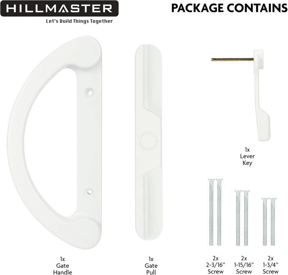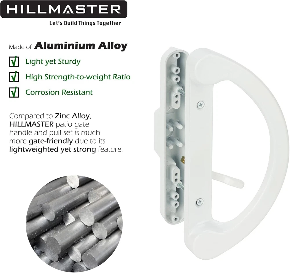 Patio Sliding Glass Door Handle Replacement Set Patio Handles Fits 3-15/16” Description 【Economical Replacement Door Handles】Don't spend too much money to replace the whole door! HILLMASTER durable universal sliding patio door handle set can complete your patio sliding door perfectly, die-cast metal white finish design fit great with any color patio glass door. 【NON-KEYED & NON-HANDED】The exterior pull comes non-keyed, sliding glass door handle suitable for mortise-style doors and features an offset thumb-turn lever, design for right or left handed. Note: This handle is not convertible with key function now. 【Package Includes】Interior Handle, Exterior Pull, Thumb Latch Lever, 6x Screws with 3 different sizes: Large 2-5/16", Medium1-15/16”, Small 1-3/4”. Note: please choose the right length screws according door thickness. 【Quick Installation】Glass Sliding Door handles set fits 1-1/4” to 1-3/4" thick door and 3-15/16" hole spacing, Standard reversible, only works with mortise hook style door handles, Note: Please refer to the dimensional details carefully before purchasing. 【Professional Guarantee】We are specialized in producing various hardware fittings more than 15 years, please go find all kinds of home hardware fittings you need in HILLMASTER store! Please feel free to contact us if there is any problem. We are committed to providing the professional products and the caring service for every consumers. Product Description Replacement Door Hadle Set When your door handle is broken, old or unsightly, don’t replace the door entirely, just get a new sliding patio door handle set. Multi-purpose Handle Hardware Perfect for screen door, storm door, sliding door, glass door, patio door and so on. Cost effective to replace old door handles. Easy and Quick Installation Just need a screwdriver and another helping hand to hold the latch in place, basic screwdriver is the only thing you really need. SHIPPING We are always working hard to ensure your package arrives as soon as possible. Please understand that some factors like weather, high postal traffic, and the performance of shipping companies are outside of our control. We offer free shipping to the lower 48 states and ship within 2 business days of payment, usually sooner. We do not accept P.O. Boxes. Please provide a physical address. For shipping outside of the continental USA, we only use eBay's Global Shipping Program.The item is shipped to KY and then sent to the rest of the world. International customers are responsible for all duties and taxes. Continue to check out in order to calculate costs for shipping the item to your country. Messages regarding eBay's Global Shipping Program MUST be directed at eBay EXCLUSIVELY. RETURNS We offer a 30-Day Return Policy on items which you are not completely satisfied with. You have the option for a full-refund or an exchange of the item. No returns are available on items shipped outside of the USA. CUSTOMER SATISFACTION We try our very best to make sure every customer is completely satisfied. If there's a problem, message us! We're happy to help.