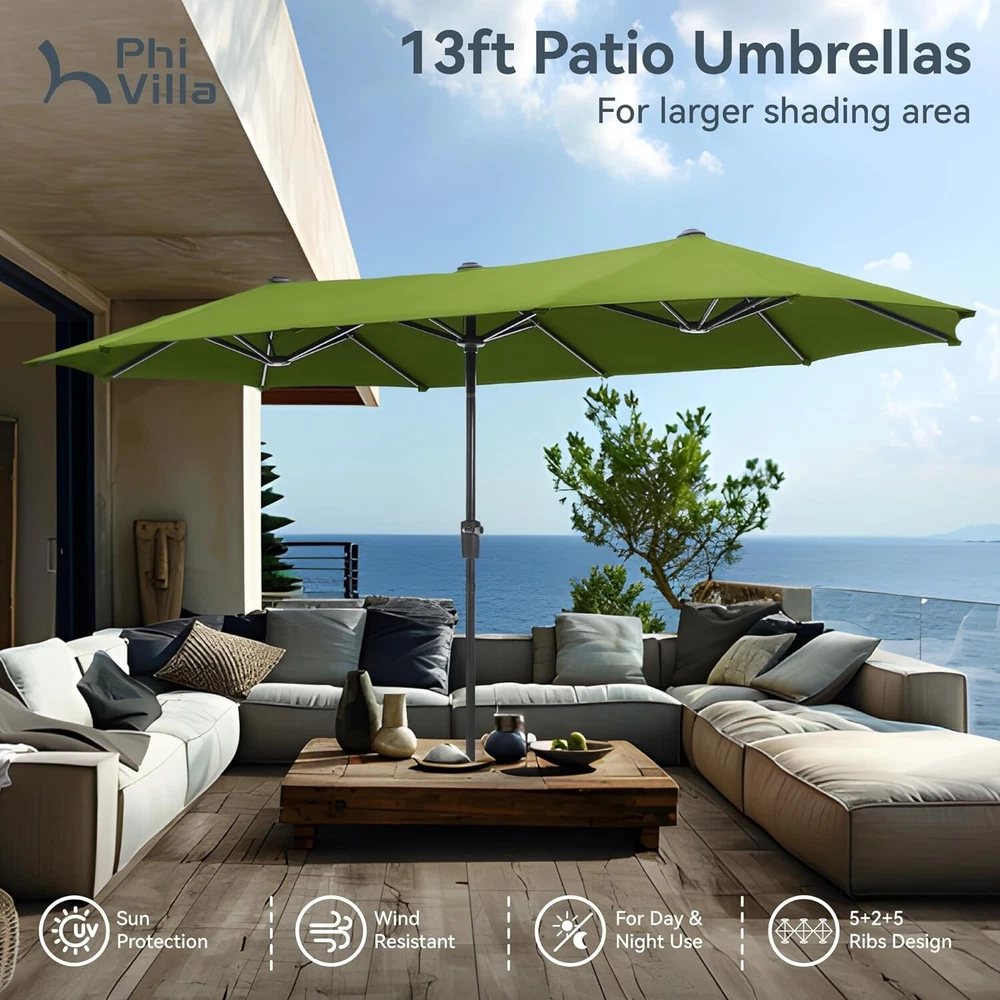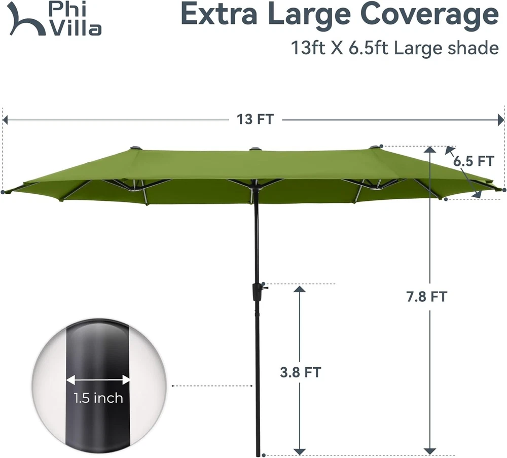 Patio Chair Patio Table Set of 2 Set of 3 Set of 5 Set of 6 Set of 7 Set of 8 Set of 9 Auction Other MENU Store Support Set of 2 Set of 3 Set of 5 Set of 6 Set of 7 Set of 8 Set of 9 Auction Other ▌ PRODUCT DETAILS: Double Canopy Umbrella: PHI VILLA 13ft double-sided patio umbrella provide wide coverage from the sun which is ideal for your family and friends at the courtyard, beach or swimming pool Easy to Use: With solid crank handle lift system for smooth and easy opening and closing. No base are included, lightweight and excellent for long table and chairs or side patio furniture set Durable Design: Superior strength and durability large umbrella with the rust-resistant steel pole and 12 steel ribs. Pole diameter: 1.5" 100% Polyester Fabric: Fade-resistant canopy, easy to clean and make your umbrella in classic and elegant apperance Dimensions: 13(L) x6.5(W) x 7.8(H) Feet; With high quality package in transit and 1 year warranty against manufacture defects; Note: Please close and tie up the umbrella when you don't want to use it, especially in windy and rainy days, so that its life is prolonged More Items About Us Welcome to our eBay store. We sale products about Home Garden,Home Organization,and Office Products. We are committed to your good buying experience from us. If you meet some problems or further questions,even some dissatisfaction with us,please give us a chance to solve the problem and offer you the best service,before leaving us a negative feedback. Meanwhile if you are satisfied with our products and service,please leave positive feedback with Four 5-Stars. Payment 1. We accept payment methods : PayPal, Payoneer, Visa, Master Card, American Express , Discover and Credit Card, etc. 2. We appreciate prompt payment and look forward to your business in the future. 3. Unpaid item will be filed without receiving payment in 7 days from listing ended. 4. If for some reason there is any issue with the purchase,please contact us prior to leaving feedback,and we will be glad to work with you to have it resolved. Shipping 1. We take great care packaging every item to ensure safe quality shipping. 2. We ship UPS/USPS/FedEx depending on your location and the shipping method you have chosen. 3. Most shipments are sent out within 1-3 business day after payment is confirmed or cleared,unless stated on otherwise in the listing. 4. Packages are not shipped on Saturday and Sunday. Transit time varies and depends on the carrier,we cannot be held responsible for delays caused by carriers. 5. Please make sure to provide the correct shipping address when placing your order,orders will be shipped out to the shipping address provided by eBay. 6. Shipping time by eBay is estimated and not guaranteed and is subject to change especially during peak periods. 7. Orders shipping to Hawaii,Puerto Rico,Guam or Alaska may not select the Free shipping option for this item,if free shipping is selected for one of these destinations we reserve the right to cancel your order. Returns 1. We offer a 30 day return policy on all items.(Unless stated otherwise in the listing). 2. All returns must be in original condition and must include the original packaging and content intact. 3. Returns should be packed in proper packaging to avoid damage to the item or it original packaging. 4. For any return request please contact our Customer Support by eBay Messages and you will be assigned an RMA number and instructions on how to proceed with your return. 5. Please allow 3-5 business days after we receive your package to process your return. 6. Any returns that violate this return policy will not be accepted and will be sent back at customers’ expense. Contact Us 1. If you have any questions or concerns about the product or the auction,please contact our customer service department via email or send us message on eBay my messages. We will give you a response in 24 hours. 2. All emails will be responded to within 12-24hours.