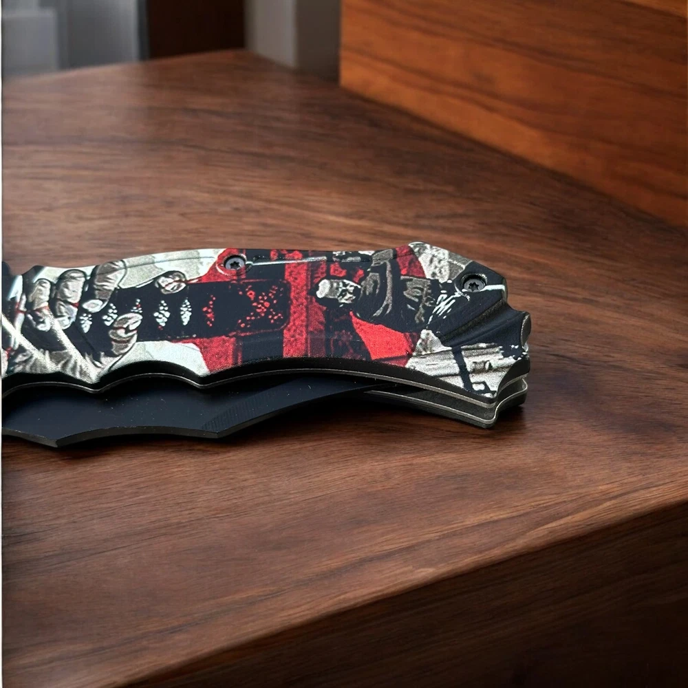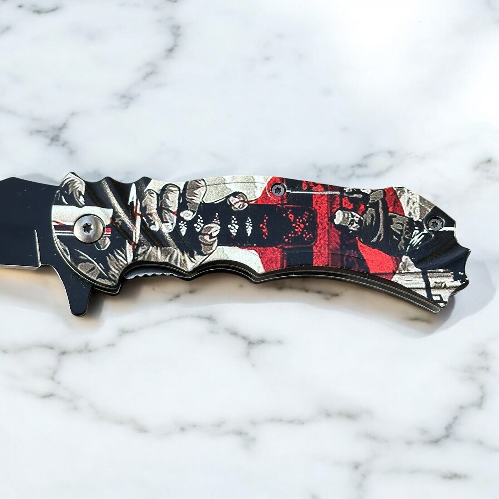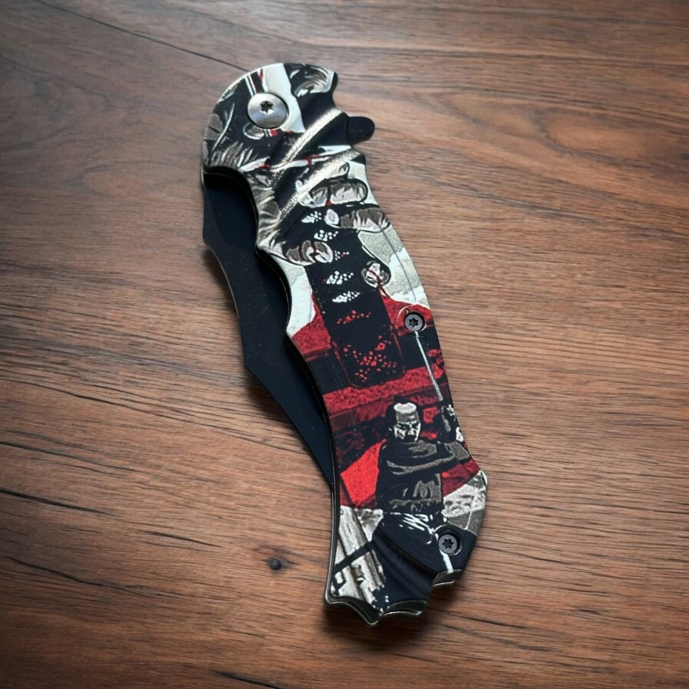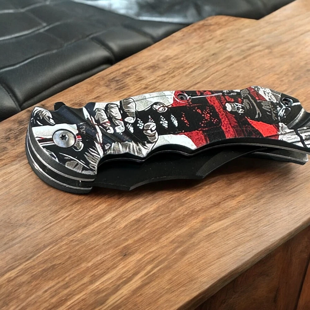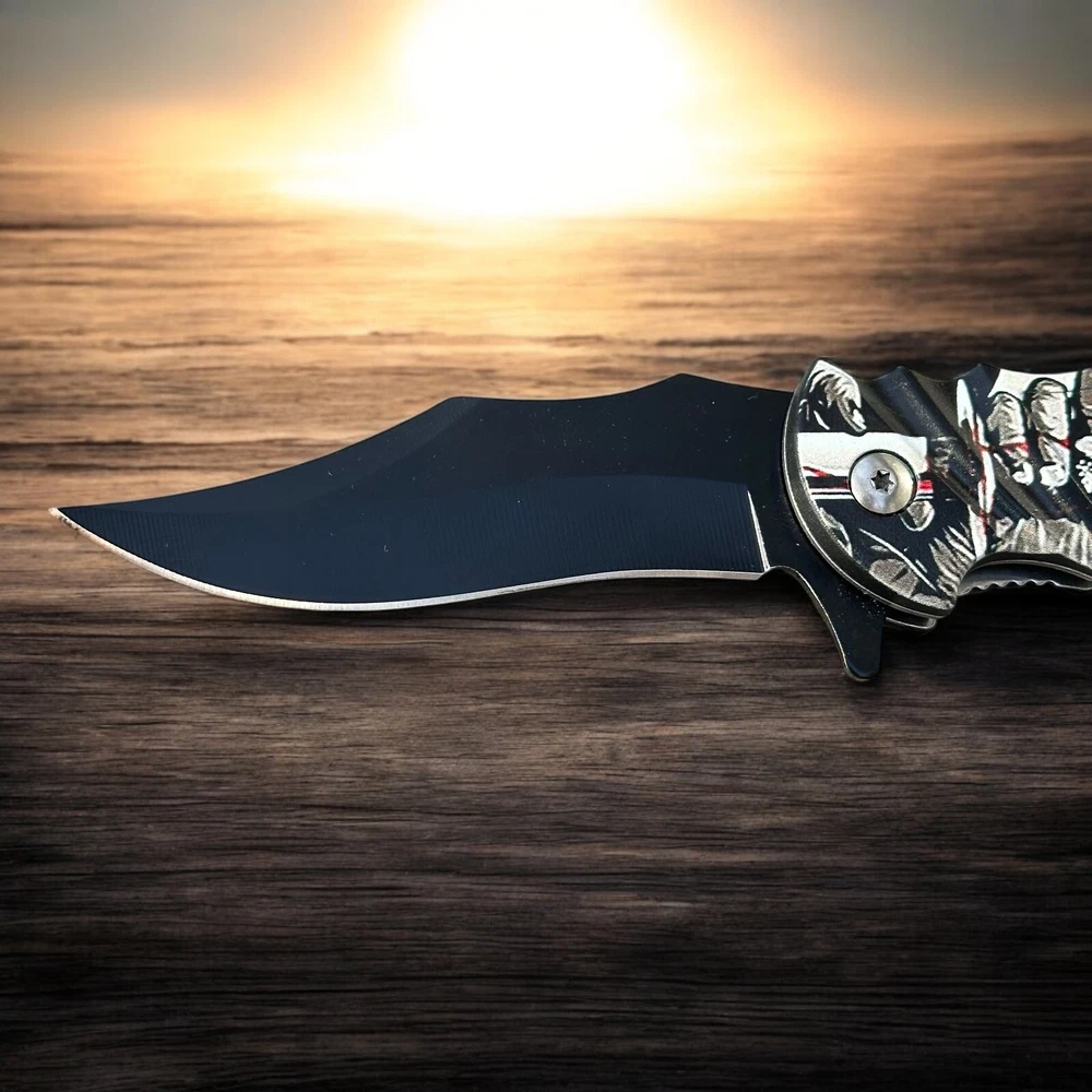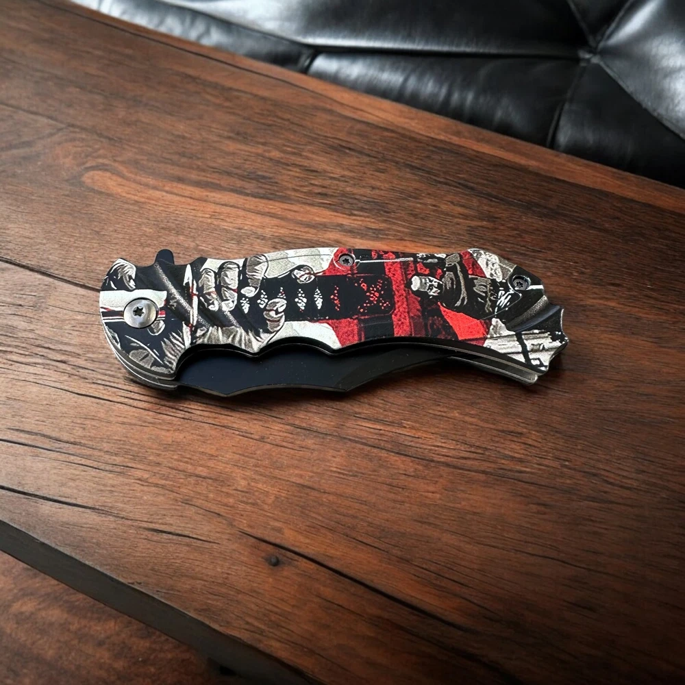 This fierce folding knife is an absolute showstopper. Designed with a bold American skull print on a contoured grip handle, it blends street-style attitude with tactical practicality. Whether you’re adding to your collection or want something that stands out in your EDC, this knife makes a statement. 🔪 Features: 🛠️ Bold skull and patriotic warrior art on the handle 🗡️ Black hawkbill-style blade with wicked curves 💥 Glass breaker and belt cutter integrated in handle 🖐️ Finger-contoured grip for a secure hold 👖 Pocket clip for quick access ⚙️ Manual thumb stud opening Buyer must be 18+ and comply with all local, state, and federal laws.