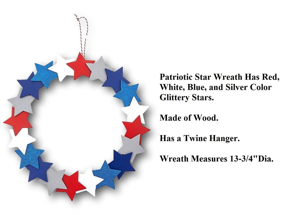 Patriotic Layered Glittery Stars Metal & Wood Door Wreath July 4th 14"Dia #029 Patriotic Layered Glittery Stars Metal & Wood Door Wreath July 4th 14"Dia #029 Click images to enlarge Description Patriotic Layered Glittery Stars Metal & Wood Door Wreath July 4th 14"Dia. Simple but with a chic look, this star wreath is perfect from Memorial Day to July 4th and beyond. Featuring stars in solid colors with some featuring glittery accents, this wreath can be hung on a wall or door either indoors or on your front door. Details: Measures 13-3/4"Diameter Made of Wood Includes Bakers Twine For Easy Hanging ~Buy more than one item at the same time from our eBay store and save in shipping costs!~ (If buying different items, just put them all in your cart before paying, to get the combined shipping discount!) Shipping We use UPS SurePost, UPS, USPS and FedEx SmartPost to deliver our products to your home, depending on which method is more efficient for your order. We use suppliers for some of our orders and our suppliers will choose the service that is used for these orders. PLEASE MAKE SURE YOUR ADDRESS CAN BE VERIFIED BY USPS. Please allow 7-10 days for the item to reach your home. We cannot be responsible for items shipped to incorrect or incomplete addresses, which may result in the cancellation of your order. YES, we do combine shipping! The highest shipping cost item ships at regular price, and each additional item ships at $2.00 more in additional shipping charges. If you are buying several different items from our store, put them all into your cart before paying to get the combined shipping discount. Terms of Sale Unless otherwise noted, we accept returns up to 30 Days after your purchase, through the eBay Returns System. Please use eBay to contact us if there is any problems or issues with your order. In some cases, we order the item purchased from one of our suppliers, and it is shipped directly from our supplier to the customer. There are times when an item unexpectedly becomes unavailable from our supplier. We do our best to check on all of the items availability several timea a day. If an item is unexpectedly unavailable, we will issue a refund immediately. Contact Us Please use the message center in eBay to contact us. We check our message box in eBay several times a day. If you have any questions or concerns with your order, please feel free to contact us. We care very much about our customers being 100% happy with their purchases. We would very much appreciate you letting us resolve any issues you may have with your order by contacting us first, before taking any other unnecessary actions. Images sell! Get Supersized Images & Free Image Hosting Create your brand with Auctiva's Customizable Templates. Attention Sellers - Get Templates Image Hosting, Scheduling at Auctiva.com.