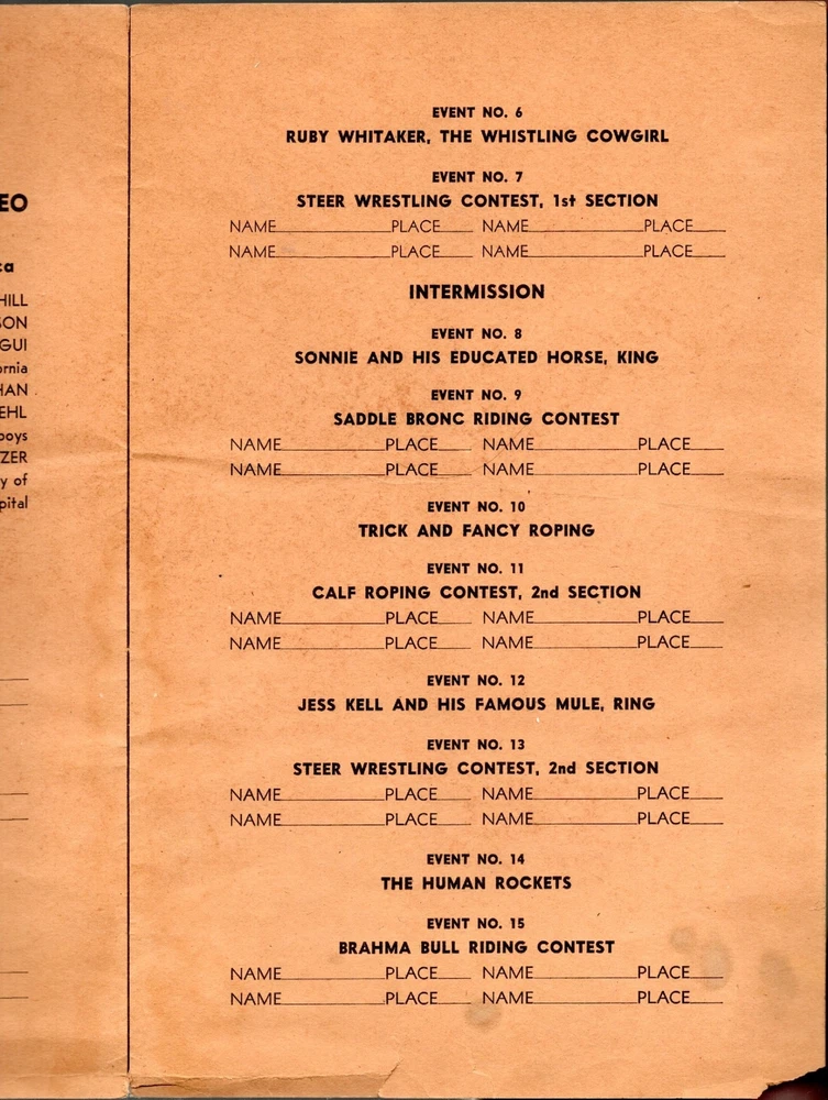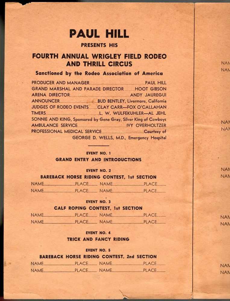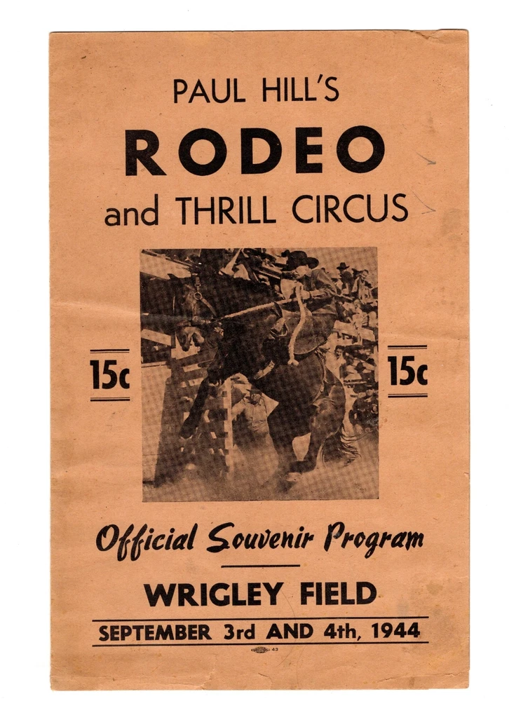 Paul Hill's Rodeo Thrill Circus Souvenir Program Wrigley Field Chicago 1944 Paul Hill's Rodeo Thrill Circus Souvenir Program Wrigley Field Chicago 1944 Paul Hill's Rodeo and Thrill Circus: Official Souvenir Program, Wrigley Field [Chicago] September 3rd and 4th, 1944 Single, tan sheet folded to 7 X 11 inches, creating four panels of printed information about the event, with the rear panel displaying a Coca-Cola ad and a picture of cowboy film star Hoot Gibson. Horizontal crease, edge tears, a shallow corner chip, and some faint staining along the fold. Writing on the rear panel in green ink indicating the attendance date. Cover photo of a cowboy on a bucking bronc. Opening the program to the interior panels reveals credits for the production of the event and a list of rodeo events, with blanks to fill in name and place for contestants, and circus-like performances, such as trick and fancy horse riding, trick roping, etc. A scarce program for this Chicago performance of the traveling rodeo/circus during World War II. Listing and template services provided by inkFrog