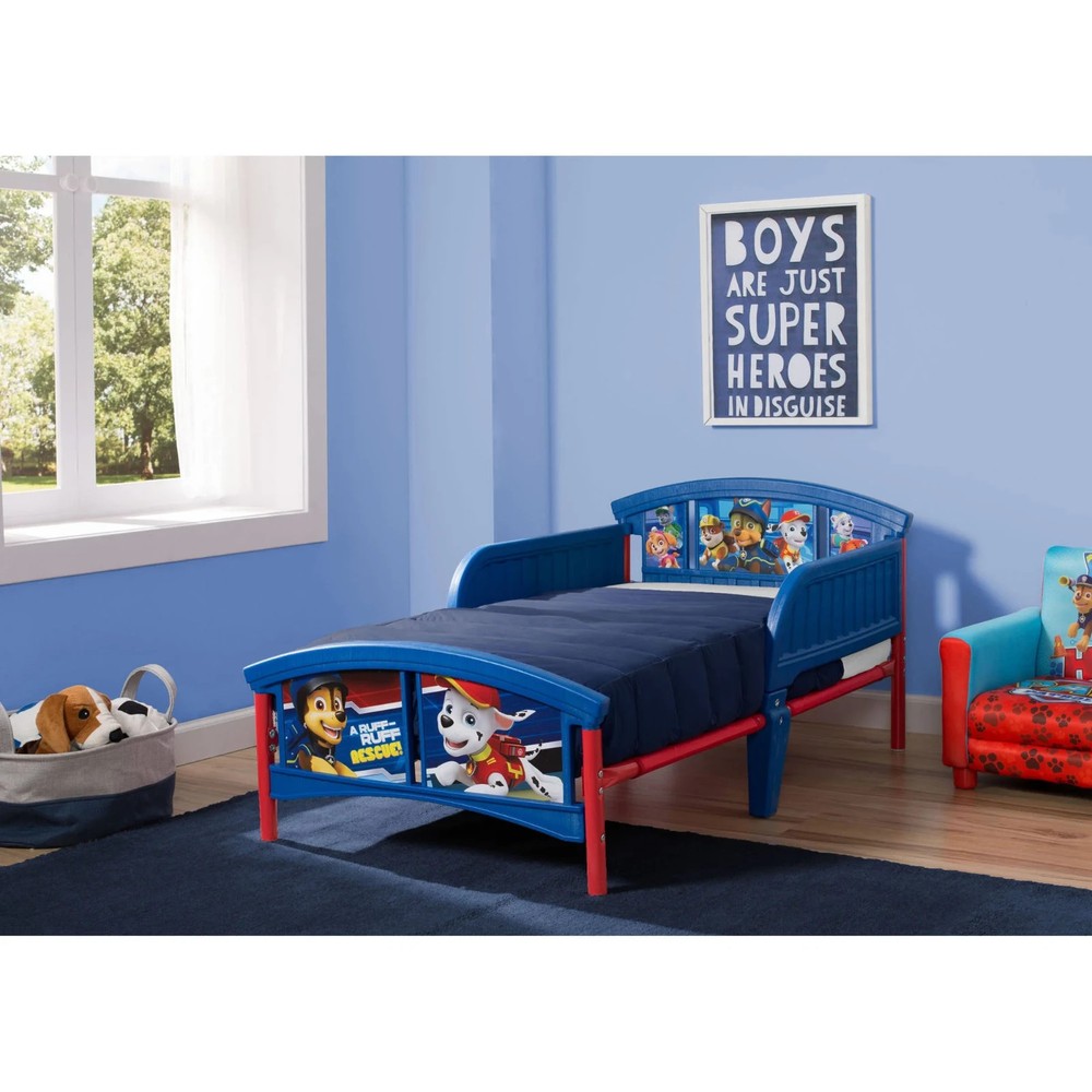 Product details There's no job too big and no pup too small for Chase and this Nick Jr. PAW Patrol Plastic Toddler Bed by Delta Children. Featuring adorable decals of Chase, Marshall, Rubble and all their furry friends, this sturdy toddler bed provides a safe sleep space that your little one will WANT to stay in all night long. Designed with attached guardrails and a low height that makes it easy to climb in and out of, the PAW Patrol Plastic Toddler Bed by Delta Children meets JPMA, CPSC and ASTM safety standards, so you can feel secure with your growing child using it night after night. Nick Jr. PAW Patrol Plastic Toddler Bed: Recommended for ages 15 months+ Holds up to 50 lbs Features 2 attached guardrails Uses a standard crib mattress (sold separately) Sturdy steel frame and high-quality plastic construction Assembly required Assembled dimensions: 53.94"L x 29.13"W x 26.18"H JPMA certified to meet or exceed all safety standards set by the CPSC and ASTM