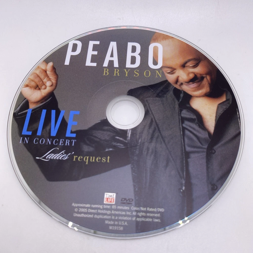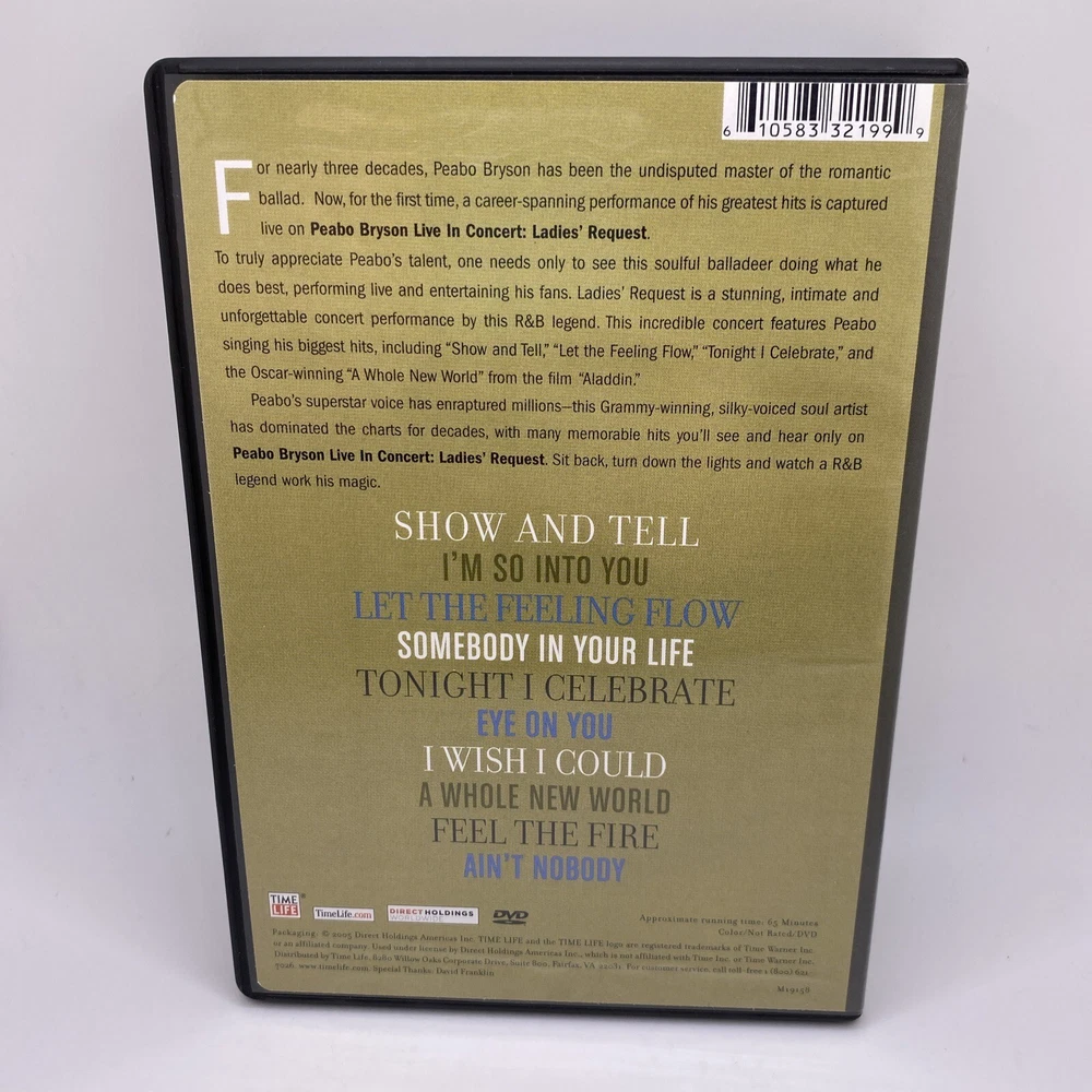 Rating: NR Format: DVD gtin13: 0610583321999 Studio: Time Life Release Year: 2005 Country/Region of Manufacture: United States Sub-Genre: Music Genre: Musical & Performing Arts UPC: 0610583321999 Subtitle Language: English Features: Full Screen Language: English Edition: Standard Edition Movie/TV Title: Peabo Bryson: Live in Concert-Ladies' Request Region Code: DVD: 1 (US, Canada...)