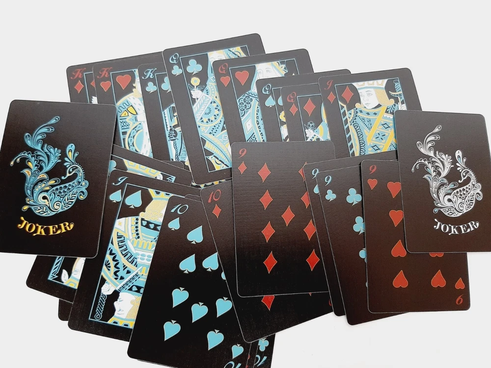 Peafowl Black Playing Cards Aloys Design Studio Yolanda Deck Linoid Finish Complete 52 card deck plus 2 jokers Very dramatic and unique dark black deck Overall good condition - box shows signs of wear, mostly at corners and edges; cards look great!
