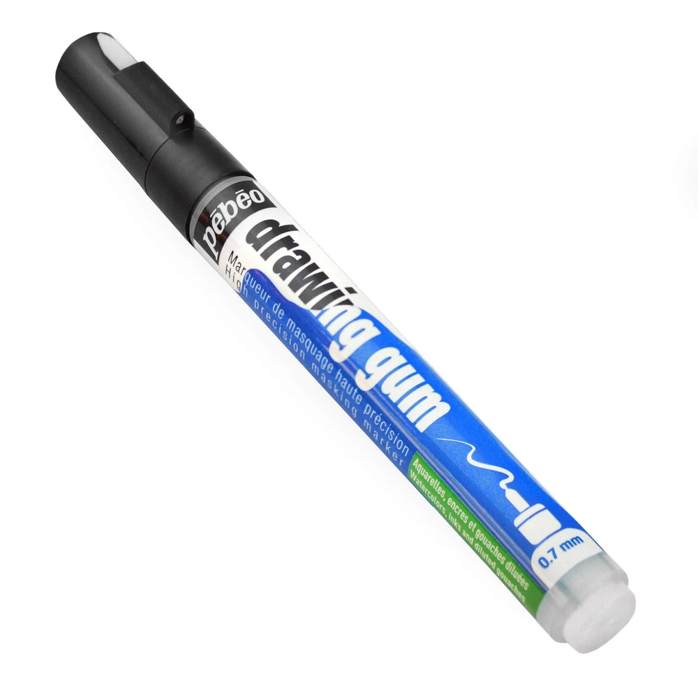 Single Drawing Gum Pen from Pebeo. High precision marker designed for masking specific areas in watercolour, ink and diluted gouache artwork. Features a 0.7mm plastic tip that allows for fine, clean, continuous application. If residue forms on the nib simply remove the excess with your finger. After use, remove the nib from the marker and clean it using warm water. Once the film is dry it is easy to remove with a finger or eraser. Can be used on a variety of mediums including cardboard, paper and Bristol board.