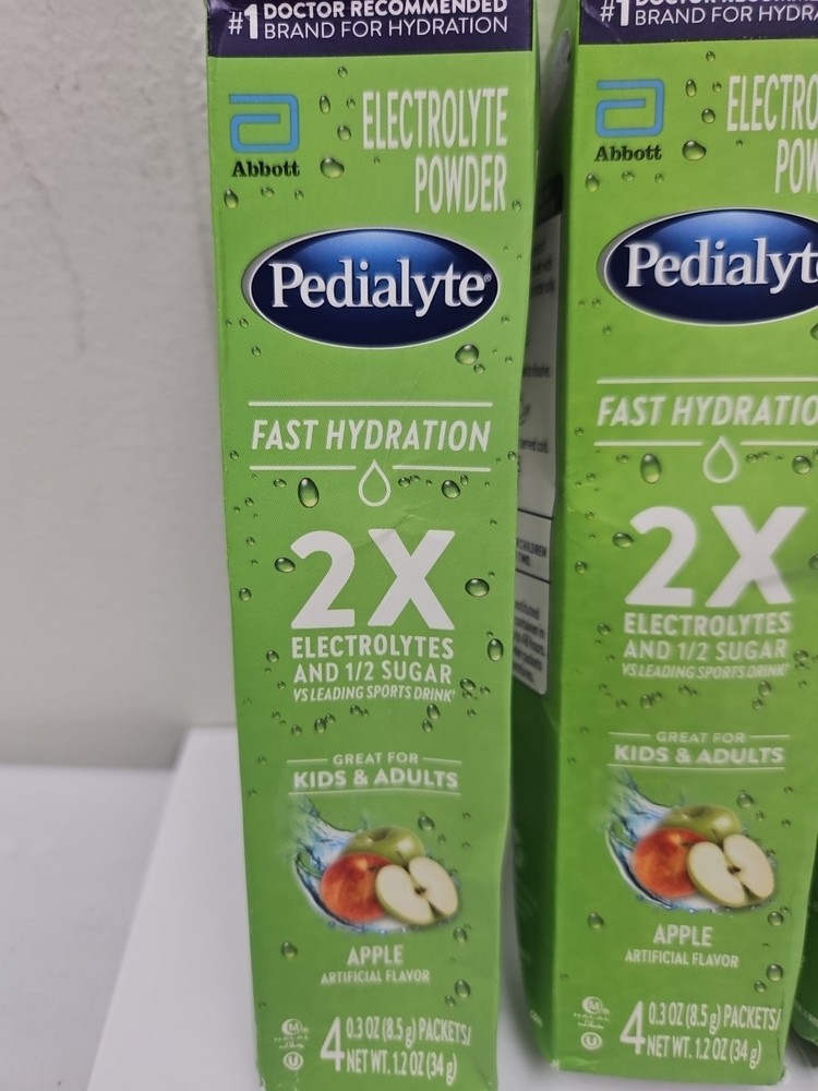 4 Boxes Pedialyte 2x Electrolyte Powder, Fast Hydration, APPLE FLAVOR 16 Total packs. 4 PER BOX FREE SHIPPING ANY FURTHER QUESTIONS PLEASE FEEL FREE TO ASK. SHIPPING: WE REGULARLY SHIP OUT SAME DAY NEXT DAY EXCEPT ON WEEKENDS IT WILL GO OUT MONDAY. OUR ITEMS HAVE DELIVERY CONFIRMATION NUMBERS . WE DO COMBINE SHIPPING WHERE APPLICABLE SO PLEASE CHECK OUT OUR OTHER GREAT ITEMS IN OUR STORE. RETURNS: WE DO OFFER RETURNS. IF YOUR ITEM IS NOT TO YOUR SATISFACTION BECAUSE OF A MISTAKE BY US WE WILL GLADLY REFUND YOUR MONIES ONCE THE ITEM IS RETURNED. ITEM MUST BE RETURNED IN ORIGINAL PACKAGING UNOPENED FOR FULL REFUND. WE WILL NOT REFUND FOR ANY OTHER REASON. FEEDBACK: WE VALUE OUR BUSINESS WITH THE EBAY COMMUNITY. IF YOU HAVE A SITUATION THAT YOU ARE UNHAPPY WITH PLEASE CONTACT US FIRST SO WE CAN WORK WITH YOU TO FIX THE SITUATION. FEEDBACK IS AS IMPORTANT TO YOU AS IT IS TO US. UNFORTUNATELY A LOT OF PEOPLE DON'T LEAVE FEEDBACK AND GET UP SET AND LEAVE NEGATIVE FEEDBACK BEFORE TRYING TO WORK ANYTHING OUT WITH THE SELLER. WE WILL LEAVE FEEDBACK ONCE THE BUYER LEAVES FEEDBACK AND WE KNOW THAT THEY ARE HAPPY. THANKS AND HAPPY BUYING