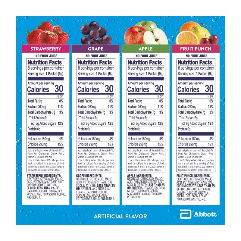 Pedialyte is the #1 doctor-recommended brand for hydration in the US and has been rehydrating families since 1966. Pedialyte electrolytes powder packets have 2x the electrolytes and 50% less sugar vs the leading sports drink.* When you’re dealing with dehydration† due to vomiting, diarrhea, extreme heat, exercise, and travel, try Pedialyte. Just mix 1 electrolytes powder packet with 8 fl oz of water, then stir or shake until dissolved. It’s great for kids and adults. These hydration packets provide a convenient on-the-go option to help replace electrolytes so you can feel better fast. * Pedialyte Classic powders have 1100mg sodium and 25g sugars per liter; leading sports drink has ~460mg sodium and ~58g sugars per liter. † Mild to moderate dehydration Pedialyte Electrolyte Powder, Variety Pack: Grape, Strawberry, Fruit Punch, and Apple, 24 Powder Packets Designed to replace fluids & electrolytes more effectively than common beverages like some sports drinks 2x the electrolytes and 50% less sugar vs the leading sports drink* Pedialyte is the #1 doctor-recommended brand for hydration Keeps you hydrated longer than water Powder packets are convenient and great for kids and adults Has 3 key electrolytes for rehydration: sodium, chloride, and potassium Variety Pack features Fruit Punch, Grape, Apple, and Strawberry electrolyte powder packets