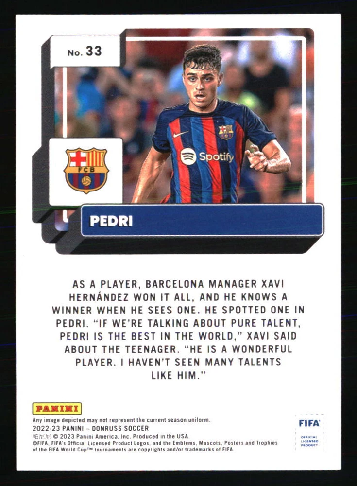 Season: 2022 Card Number: 33 Manufacturer: Donruss Team: FC Barcelona Sport: SOCCER Autographed: No Year Manufactured: 2022 Set: 2022-23 Donruss Type: Sports Trading Card Graded: No Player|Athlete: Pedri