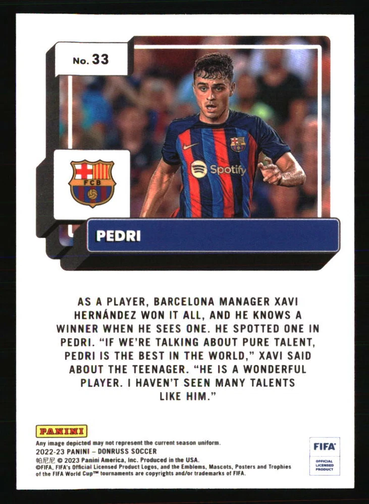 Team: FC Barcelona Manufacturer: Donruss Player|Athlete: Pedri Autographed: No Card Number: 33 Season: 2022 Year Manufactured: 2022 Sport: SOCCER Graded: No Insert Set: Optic Type: Sports Trading Card Set: 2022-23 Donruss