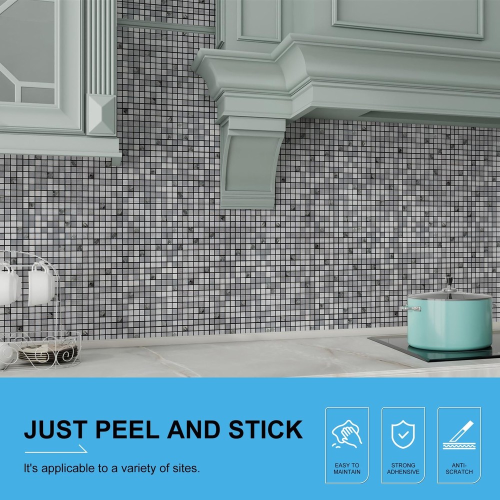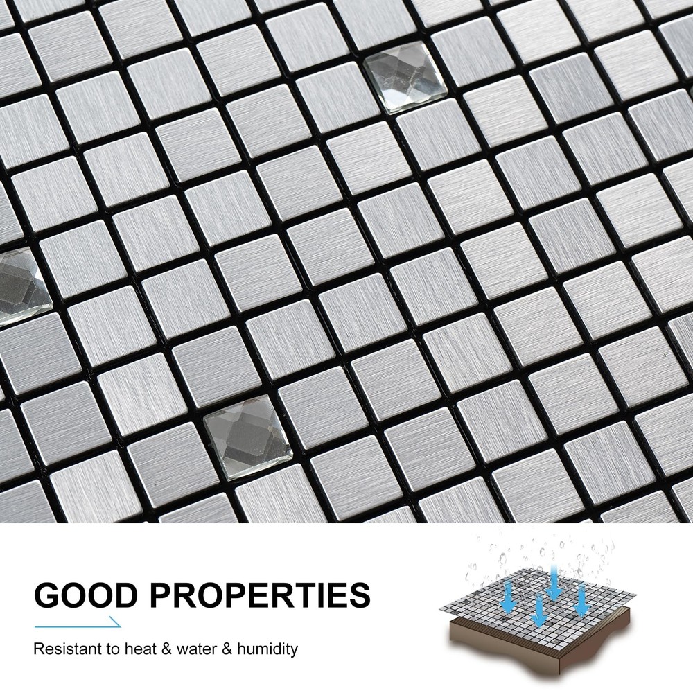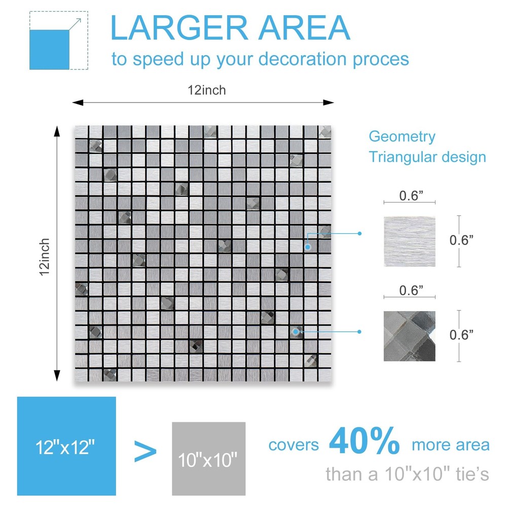 Peel and Stick Metal Backsplash, 8-Sheet Peel and Stick Glass Mixed Metal Tiles Stick on Backsplash for Kitchen Bathroom Wall Metal Backsplash Size: Come in a box of 8 sheets peel and stick metal backsplash tile, 11.8"L x 11.8"W x 0.2"H each, covering about 7.75 square feet Glass Mixed Metal Backsplash Tile: The design of metal and the glass will provide space with light and excellent visual quality, especially as a mirror edge Easy to Apply: Just peel and stick to install, no need to overlap, no grout and no mess, save your time and money on labor Waterproof and Heat Resistant: Lightweight, stiff and firm, resist to the heat, moisture and water in kitchen and bathroom, easy to maintain Multiple Usage: Widely used in kitchen backsplash, bathroom walls, shower, fireplace, and installed behind the stove