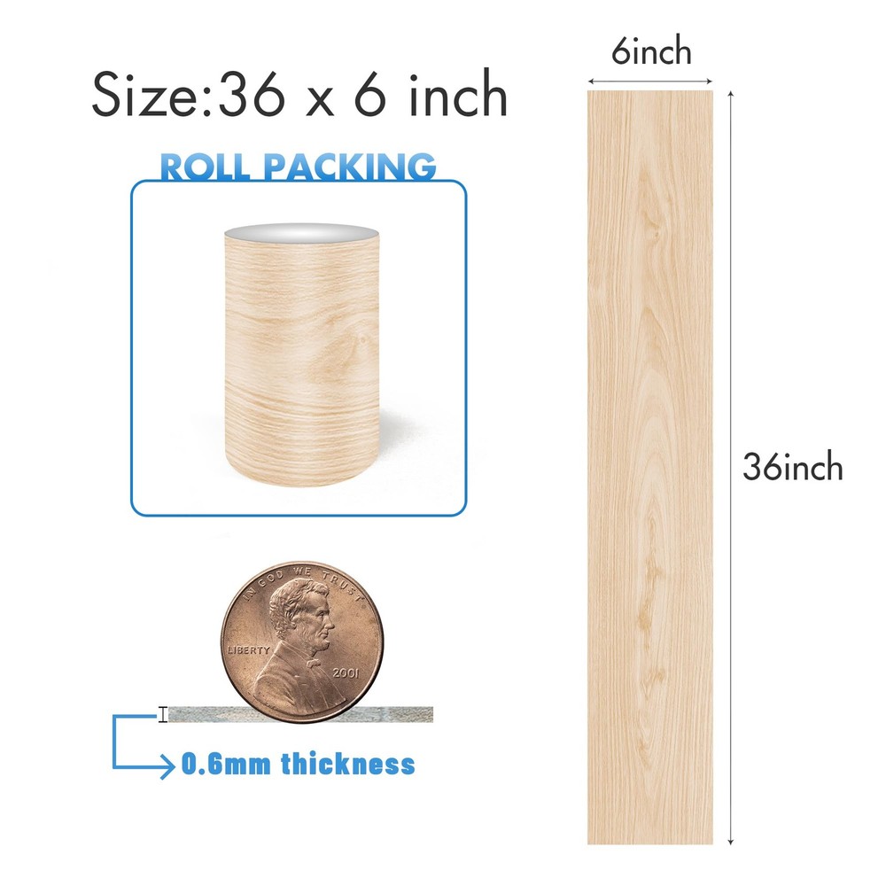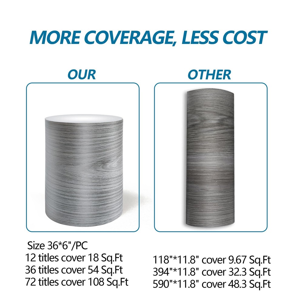 Do you want to give your room a brand new look and at a low cost? Authentic wood looking and grain texture, adding timeless feature for your home. No messy glue or adhesives needed. Just peel and stick the vinly laminate flooring tiles to your original flooring and show off your beautiful new room to all your friends and neighbors. Peel and Stick Floor Tiles that measures LxW 12 x 6 Made of durable vinyl, thickness: 0.025 In (0.6MM). 【Easy Installation】 - Just peel and stick our self-adhesive wood vinyl flooring onto the original flooring or wall. It's easy to cut with scissors or a knife, requiring no power tools, prior experience, glue, or accessories. 【 Not sticky residue left】 - Self adhesive and removable. No sticky residue left, not damage the floor. Durable thin wood vinyl flooring peel and stick tiles for floor. peel and stick waterproof floor tiles feature WPU Pressure Sensitive Adhesive for strong bonding with minimal gaps Crafted from durable PVC, they've passed rigorous wear tests for long-lasting quality. 【Consistent Color】 - When purchasing our vinyl flooring, there's no need to worry about noticeable color differences between batches. Colors will be as consistent as possible in all batches.【Multi-Scene 】-The vinyl flooring tiles are attached to any flat, clean and dry floor. The stick and peel floor tiles ideal for kitchens, bathrooms, corridors,laundry, living rooms, RV, entryway, bedrooms. 【Superior Properties】 - Our peel and stick floor tile offer exceptional waterproofing,durability, and easy to clean and care. With a wear-resistant, heatresistant, and non-slip design, they ensure long-lasting strength and safety. 【Size & Coverage Area】 - Each floor tile measures 36 x 6 inches, with a thicknessof 0.6mm. A set of 36 pcs covers an area of 54 Sq.Ft, while 12 pcs cover 18 Sq.Ft. lf you're unsure about the product, you can start by purchasing just 22 pcs to assessthe results without disrupting your daily life.