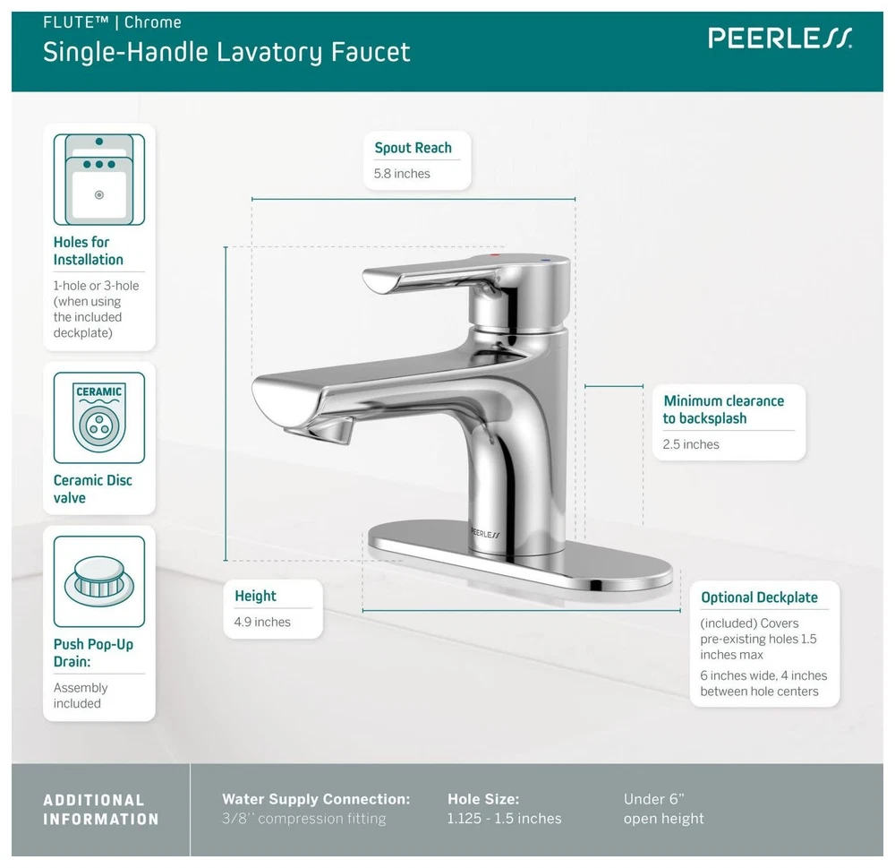 Powered by Frooition All Categories Peerless P1512LF Flute 1 GPM Single Hole Bathroom Faucet with Pop-Up Drain Assembly Overview Item Description Peerless P1512LF Features: Covered under Peerless's limited lifetime warranty Faucet body constructed of zinc Coordinates with products from the Flute line Single hole mounting type Deck mounted installation - 1 hole faucet mounts directly to sink or countertop Single lever handle controls the flow and temperature of water Faucet includes ceramic disc valve Pop-up drain assembly included Includes optional escutcheon base plate - for sinks with 3 faucet holes Complies with ADA standards Low lead compliant Peerless P1512LF Specifications: Height: 4-5/16" (deck to top of faucet) Spout Height: 2-5/8" (deck to spout outlet) Spout Reach: 4-5/16" (faucet base to spout outlet) Flow Rate: 1 gallons-per-minute Maximum Deck Thickness: 1-5/8" (cannot mount on thicker decks) Faucet Hole Size: 1-1/8" to 1-1/2" Faucet Holes: 1 (minimum number of holes required for installation) Why Choose BuildInc? OUR PROMISE TO YOU About Us At Build, we promise to provide the best selection we can, most competitive pricing, and unmatched customer service. Our store has quality home improvement products from trusted manufacturers like Moen, American Standard, Delta, Kraus, Kichler, Progress Lighting, Schlage, Kwikset, Baldwin, Broan, NuTone, Air King, and Rev-A-Shelf. With over 200,000 home improvement products for you to choose from, we have just what you need to get your project done. Fast & Free Shipping We promise to make it our priority to get you your items as fast as we can. We ship from 440 warehouses around the country, ensuring that your product will get to you as soon as possible. We know you're eager to get your hands on your new purchase, we would be too. As a bonus, most items ship for free. Returns We are happy to accept returns of unused or defective items for a refund within 30 days from the date of delivery. For returns outside 30 days, please contact our Customer Service team to go over our options. For full details, please view the Shipping and Payments tab above. To initiate a return simply go to the eBay Returns Portal and submit a return request. We ask that all items be returned with all original components via a traceable method. Once your return is received and processed, we will quickly get your refund or replacement issued. If for any reason you are unsatisfied with your purchase or for product or warranty questions, please contact Customer Service team for assistance. More Items! View more great items! About Us | Shipping | Returns | Contact Us | FAQ | Collections | Special Offers! Powered by Frooition Frooition Frooition | No-js Template | eBay design, eBay store design, eBay shop design, eBay template design, eBay listing design (ver:froo_no_js) This listing is currently undergoing maintenance, we apologize for any inconvenience caused.