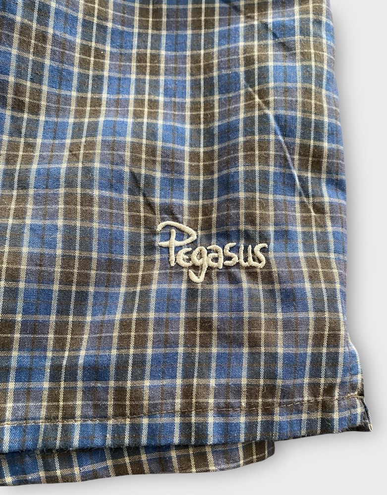 The Pegasus Swim Trunks in Men's size Large are a stylish and functional choice for your next beach outing. The blue plaid pattern adds a touch of personality, while features like an elastic waist, quick-dry fabric, and pockets ensure you stay comfortable and practical while in the water. Whether you're lounging by the pool, swimming in the ocean, or just enjoying some time by the lake, these swim trunks are a great choice for any water activities. Easy to care for with machine washable instructions, these trunks are a must-have for your summer wardrobe.