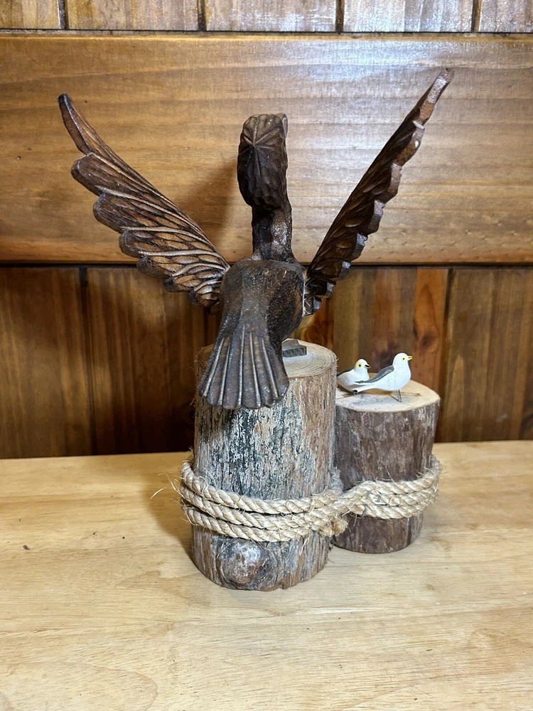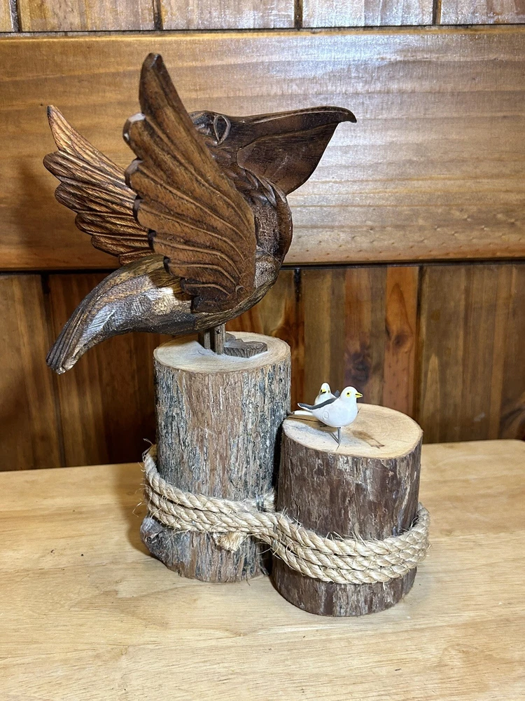 This beautiful wooden sculpture features a pelican standing on a pedestal with two seagulls perched nearby, all meticulously hand-carved. The attention to detail in the carvings is truly remarkable, and the piece would make a stunning addition to any collection of decorative collectibles or sculptures and figurines. The brand of the sculpture is Wooden, and it boasts a number of impressive features including intricate carvings and a lifelike depiction of the subject, a seagull. The piece measures 10.5 inches in height and 9 inches in width, making it a substantial and eye-catching addition to any space.