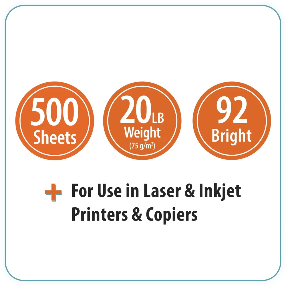 Get creative with Copy Paper, great for home, office, or school. This easy-to-use printer paper lets you make your designs in rich black and color ink. The pack has 500 sheets that work with laser and inkjet printers and copiers, giving you great prints. It's perfect for printing handouts, making signs, or even starting a craft project. This white paper can be used for many things. Be sure to check out other products such as pens, markers, desk organizers, file folders, highlighters, sticky notes, and more for all your school and office supply needs. Choose Copy Paper today and make your next project a success! Copy Paper, 8.5" x 11", 20 lb, White, 500 Sheets Perfect choice for use at home, office, or school Works with laser and inkjet printers and copiers 500 20 lb sheets in 92 bright white Pair with other products