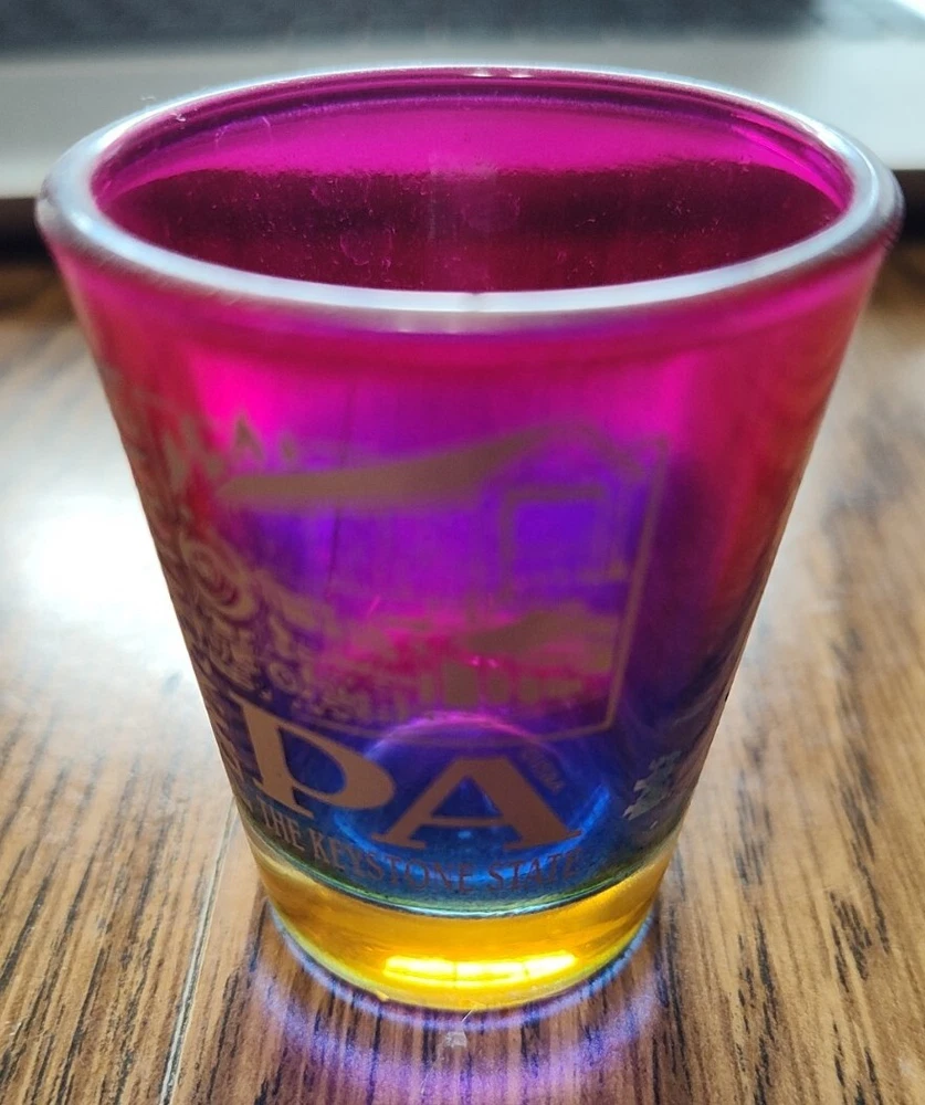 Introducing a colorful shot glass featuring Pennsylvania, also known as The Keystone State.