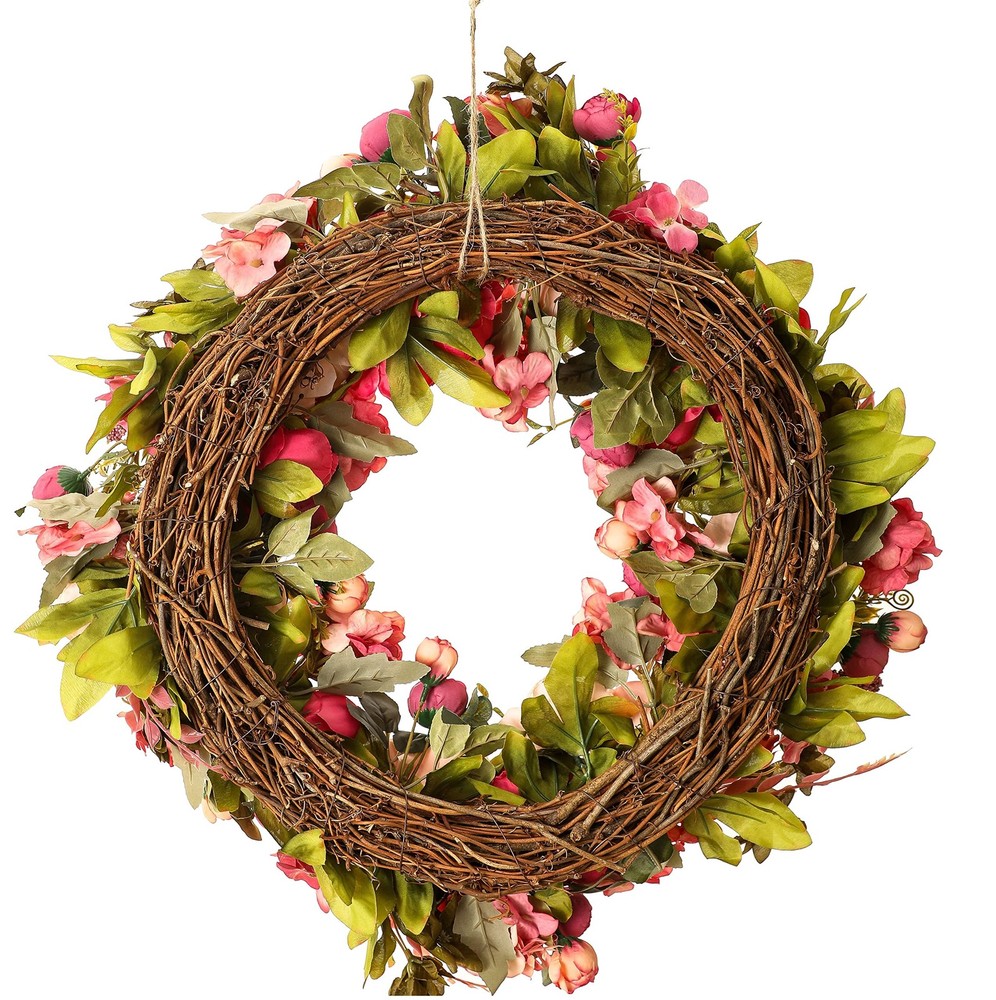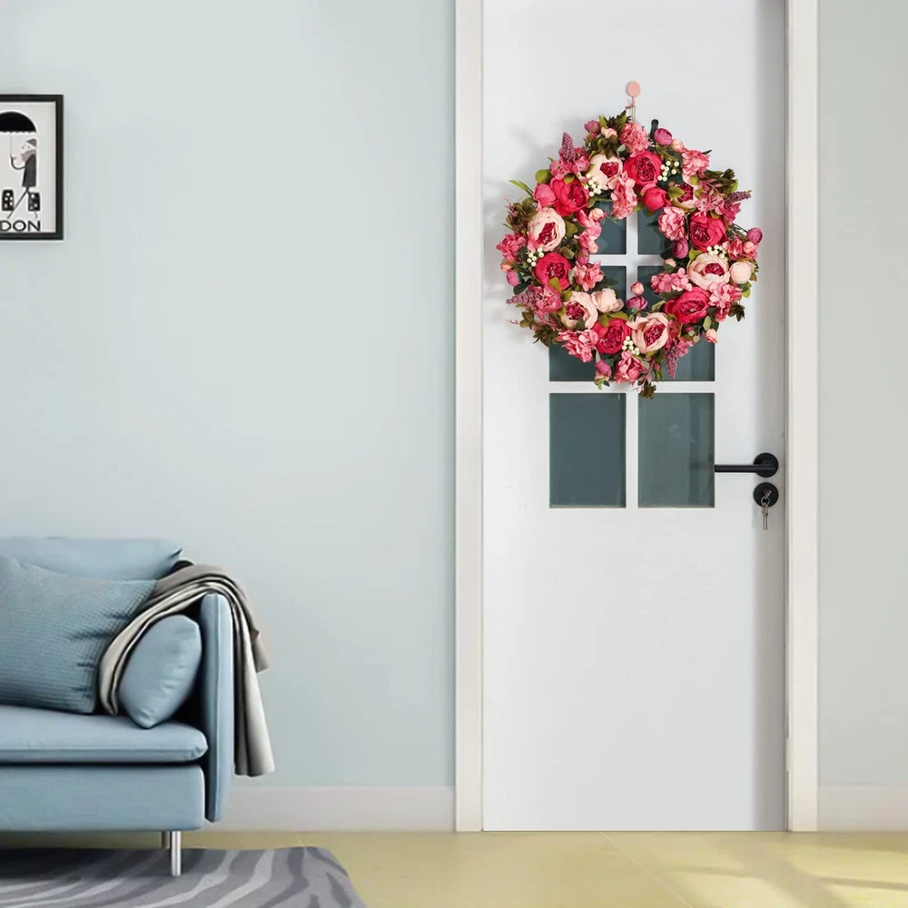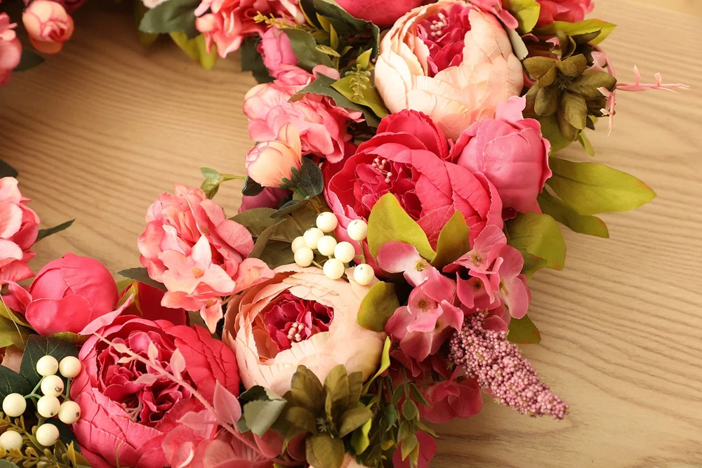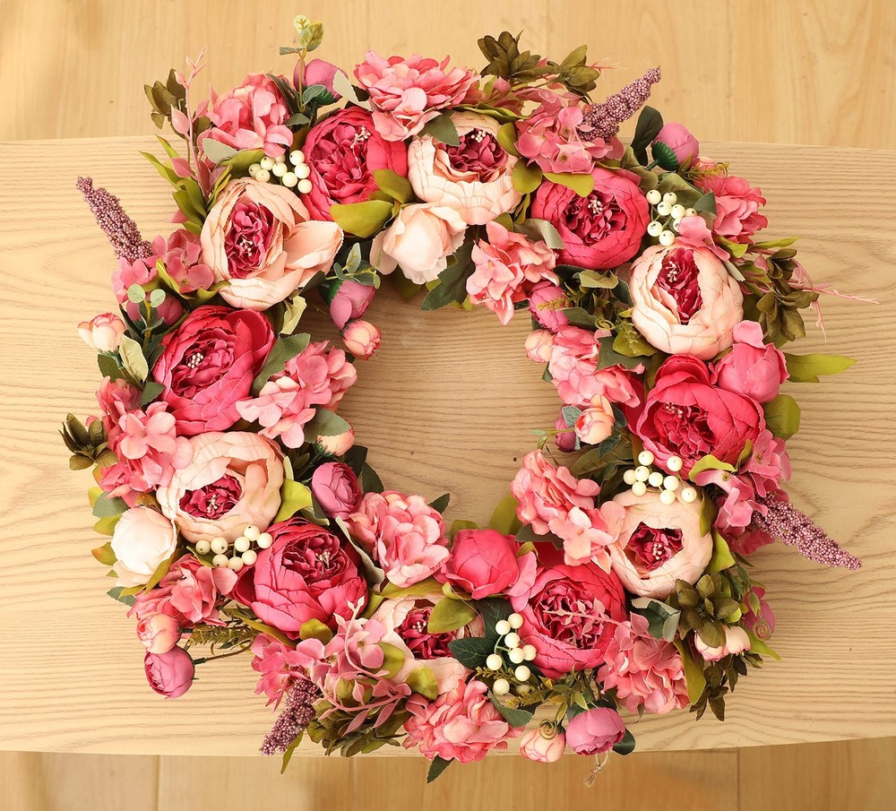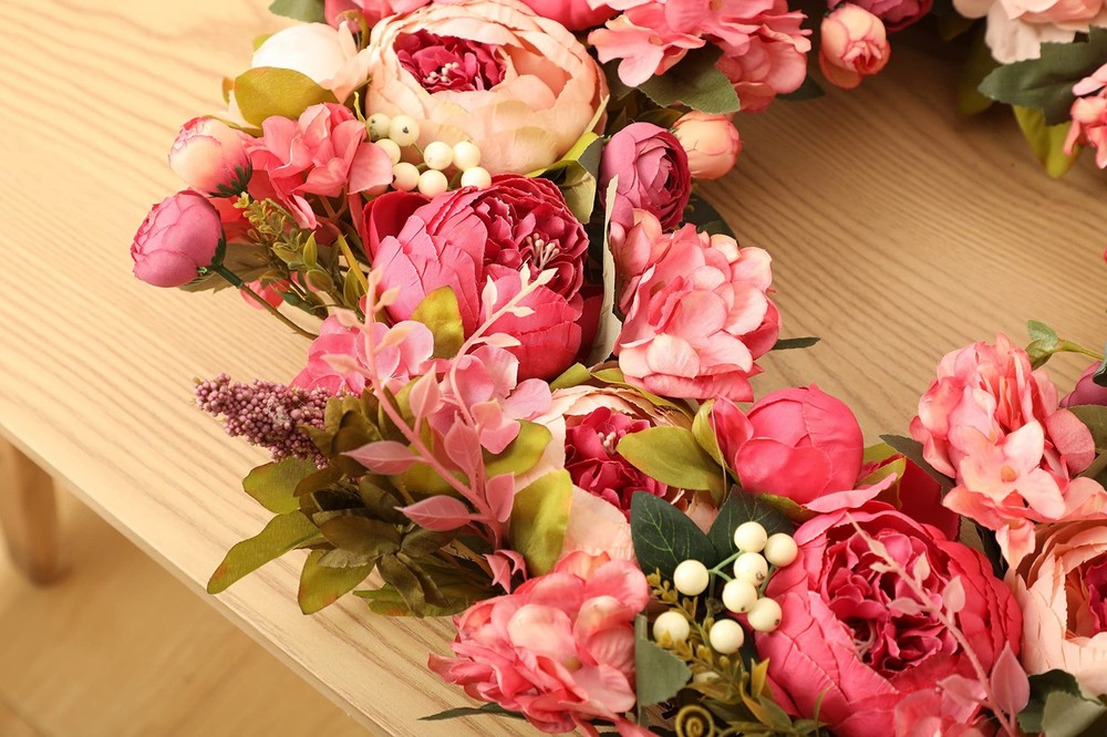 Spec: Material: Silk, fabric and rattan Size: Outside diameter: about 24"+/-0.5" Inner diameter: about 6" Large flower diameter: about 3” Small flower diameter: about 1” Thickness: 8 cm / 3" Package : 1 * Peony Wreaths 【Material】This front door wreath is a fluffy and full of vitality wreath for front door,by many different sizes of pink,little pink,dark pink,red and other colors of peony,hydrangea,eucalyptus leaves and thick grapevine base composition,inner and outer are a lot of flowers embellishment,flowers lush and beautiful,the flowers are all very securely attached,and the grapvine base is also secure and does not shed.The craftmanship very good. 【Beautify】This Large spring wreath for front door makes for an attractive entrance way.These flowers are lush and realistic.The wreath is well made and impressive.This wreath is gorgeous, It truly is chock full of peony flowers which is awesome. 【FullHand】This peony wreath is an exquisite hand-made wreath.The details and quality are our first guarantee.The quality is excellent,the shape is realistic,just like natrue.The wreath will need to be reshaped, and can be easily bent for reshaping - please separate and loosen flowering stems to achieve the desired fullness. 【Occusion】This full season wreath can be used indoors and outdoor, hant it over the fireplace and put it on your front door,wall,window.It also can be used as a candle wreath for table decoration.This wreath creates a pleasant atmosphere all year round.It is also suitable for Venlentine's day,Easter,Mother's day,Christmas day etc. 【EasyUse】The wreath is easy to use for a long time, hang it on your front door.If it is dirty, you can wipe it with a soft wet cloth to make the wreath as bright as new. No maintenance required.No watering is required.Looks plump and fresh every day.
