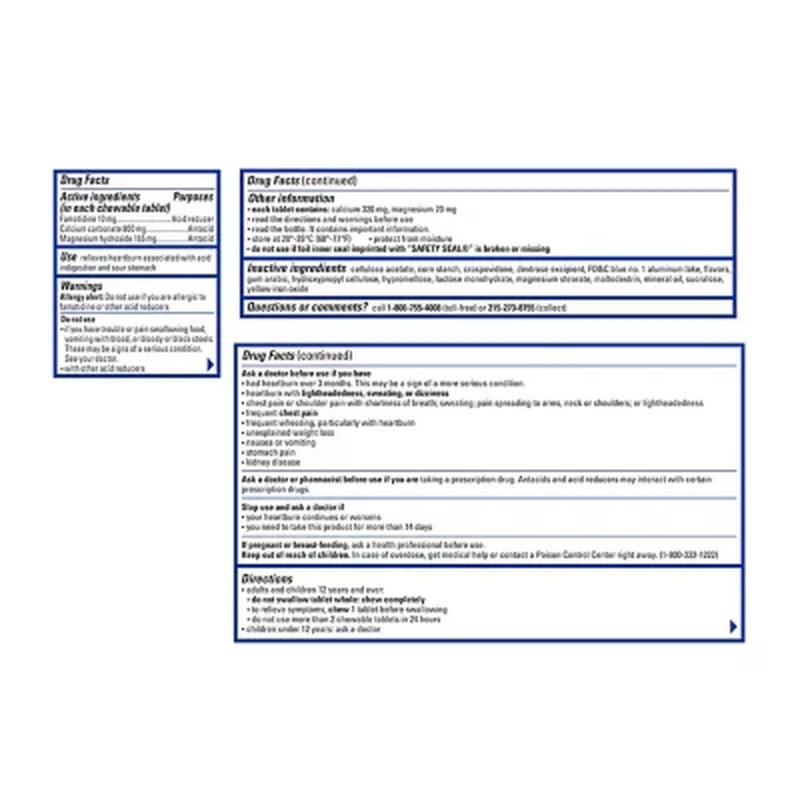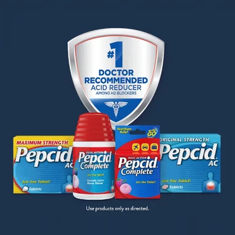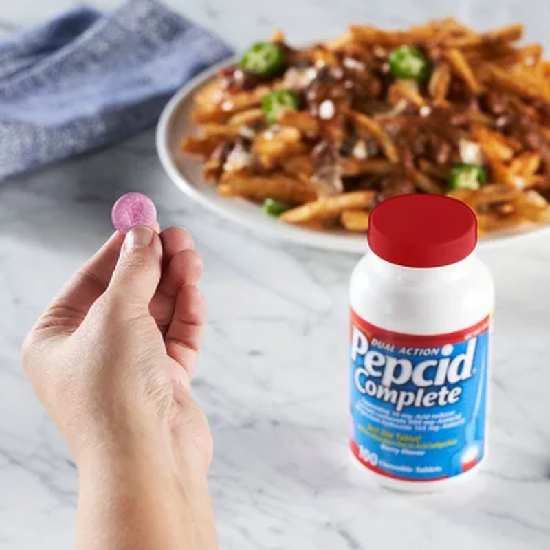 Reach for Pepcid® Complete for fast heartburn relief. When heartburn hits, you want immediate relief, and you want that relief to last. Pepcid tablets feature a unique formula that helps to neutralize acid quickly and protect against continuing pain, so you can enjoy your meal and the rest of your day. How is Pepcid Complete Unique? Pepcid tablets feature a powerful, fast-acting formula that helps to neutralize acid in seconds for immediate comfort. Additionally, they offer dual action by continuing to protect against heartburn for the next 8 hours, so there's no concern for heartburn creeping back up. Pepcid chewable tablets contain effective active ingredients like 10mg of famotidine, as well as antacids like calcium carbonate and magnesium hydroxide, for powerful relief. It's also unique because it combines antacids with an H2 acid reducer. How Do You Take Pepcid Tablets? There's no need to dissolve tablets in water or swallow uncomfortable pills to take Pepcid Complete. This product comes in easy, chewable tablets, so you can take them without water at home, on the go or in the office. So you won't find yourself in a situation where you can't get heartburn relief. Enjoy impromptu meals out with friends or dinner parties without worry. Easy to Take Pepcid tablets have a delicious berry flavor, so they're easy to chew and swallow. You only need to take one tablet for effective and fast relief. This purchase comes as a 100-tablet bottle, so it's sure to last even with frequent use.