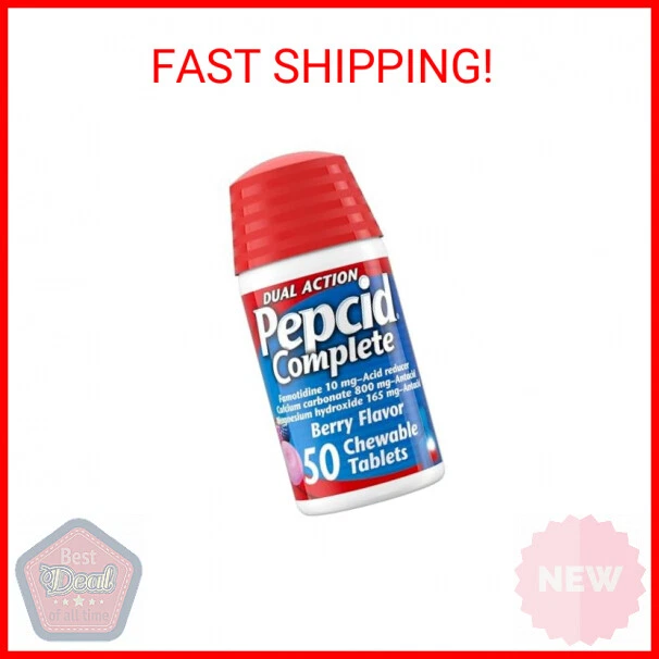 WELCOME TO THE SHOP Pepcid Complete Acid Reducer + Antacid Chewable Tablets, Heartburn Relief, Berry, 50 Count - 50-count bottle of Pepcid Complete Acid Reducer + Antacid Chewable Tablets with Famotidine + Antacid in berry flavor to help provide fast heartburn relief from acid indigestion - Just one acid reducer + antacid chew starts relieving indigestion in seconds for effective acid control that lasts all day or all night (based on 9-hour acid control studies during the day and 12-hour acid control studies during the night) - Each chewable heartburn reliever tablet is specially formulated with 10 milligrams of famotidine, a known acid reducer, plus 800 milligrams of calcium carbonate and 165 milligrams of magnesium hydroxide, which are antacids - The chewable berry-flavored heartburn medicine features a dual-action formula containing both an acid reducer and antacids to control and neutralize acid, and lasts longer than Tums (Tums is a registered trademark of GlaxoSmithKline) - Formulated to relieve heartburn due to acid indigestion and sour stomach, keep a bottle of Pepcid Complete Acid Reducer + Antacid Chewable Tablets at home and one in the office to relieve heartburn whenever it strikes Payments We accept the following payment methods PayPal Please pay as soon as possible after winning an auction, this will allow for quicker shipping times! Returns We do not accept returns please message if you have any problems. Shipping Shipment processing time All orders are processed within 2-3 business days. Orders are not shipped or delivered on weekends or holidays. If we are experiencing a high volume of orders, shipments may be delayed by a few days. Please allow additional days in transit for delivery. If there will be a significant delay in shipment of your order, we will contact you via email or telephone. Shipping rates & delivery estimates Shipping charges for your order will be calculated and displayed at checkout.