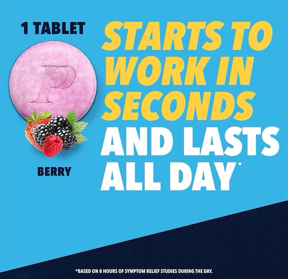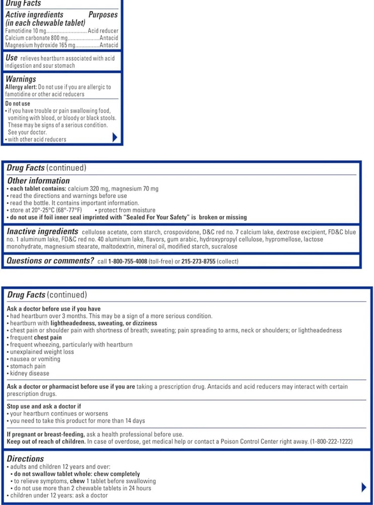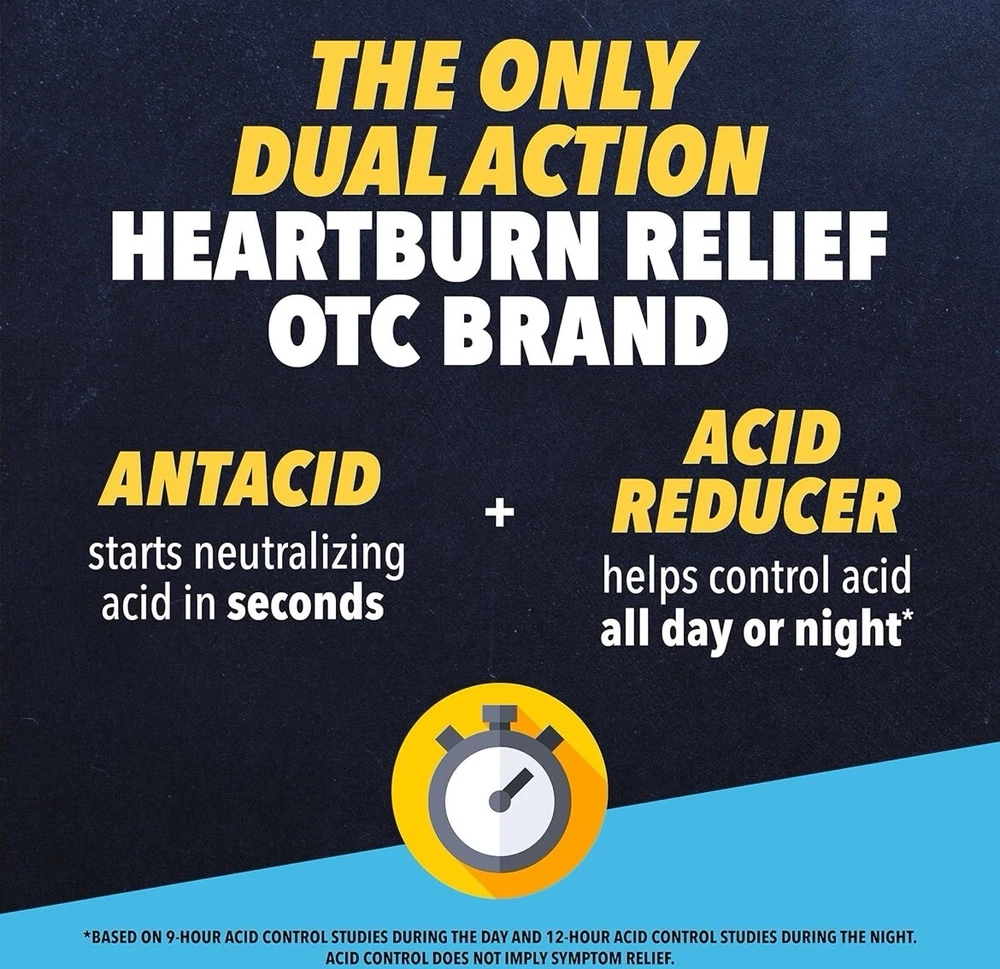 ******. -DOUBLE DEFENSE: Provides immediate relief from existing discomfort while preventing fresh waves of heartburn for hours to come -LONG-LASTING FREEDOM: Experience up to 12 hours of control, even overnight -CHEWABLE CONVENIENCE: Delicious berry-flavored chewable tablets dissolve delightfully in your mouth; Perfect for on-the-go lifestyles or those who prefer a gentler delivery method -GENTLE ON YOUR SYSTEM: No chalky aftertaste, no upset tummy - just pure, unadulterated relief -CLINICALLY PROVEN: Provides rapid and prolonged relief from heartburn, indigestion, and sour stomach