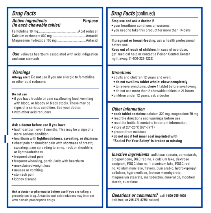 Quickly relieve heartburn and reduce acid associated with acid indigestion and sour stomach with Pepcid Complete Acid Reducer + Antacid Chewable Tablets. These berry-flavored heartburn relief antacid chews combine a fast-working antacid and long-lasting acid reducer to help control acid all day or all night. Formulated with 10 mg of the acid reducer Famotidine, 800 mg of the antacid calcium carbonate, and 165 mg of the antacid magnesium hydroxide per tablet, this heartburn reliever helps to neutralize and control acid. Product Features: 100-count bottle of Pepcid Complete Acid Reducer + Antacid Chewable Tablets with Famotidine + Antacid in Berry flavor to help provide fast heartburn relief from acid indigestion. Just one acid reducer + antacid chew starts relieving indigestion in seconds for effective acid control that lasts all day or all night (based on 9-hour acid control studies during the day and 12-hour acid control studies during the night). Dual-action formula starts neutralizing acid in seconds & provides heartburn relief that lasts. This item can only be shipped to an address verifiable on public record. It cannot be shipped to APO/FPO, PO boxes or other mailbox services, freight forwarders or forwarding agents, and may not be available for delivery to certain businesses or zip codes. We ship to the lower 48 contiguous United States only. We cannot ship this item to Alaska/Hawaii or US Protectorates.