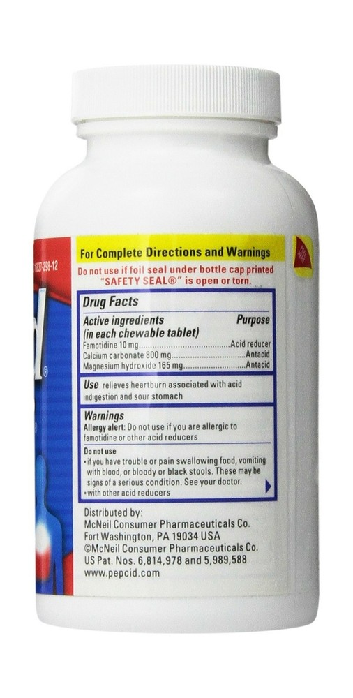 Brand New Pepcid Complete Dual Action Acid Reducer and Antacid Berry Flavored Chewable Tablets 100 Count Bottle Manufacturer model: 134575 Pepcid Complete Dual Action Acid Reducer and Antacid Berry Flavored Chewable Tablets 100 Count Bottle Description Pepcid Complete Dual Action Acid Reducer and Antacid Berry Flavored Chewable Tablets 100 Count Bottle Shipping and Handling Please allow 5-7 business days for the package to arrive, regardless of buyer location within the US. We will provide an online tracking number to you once the item has been shipped. It may take a few business days for our automated system to process the tracking number onto eBay. However, this will not affect the shipping times. Return Policy All our products are brand new and sealed. All items qualify for returns within 30 days of receipt. Feedback We take our reputation seriously. If you have any questions or concerns, please contact us and we will respond back to your message within 24 hours.