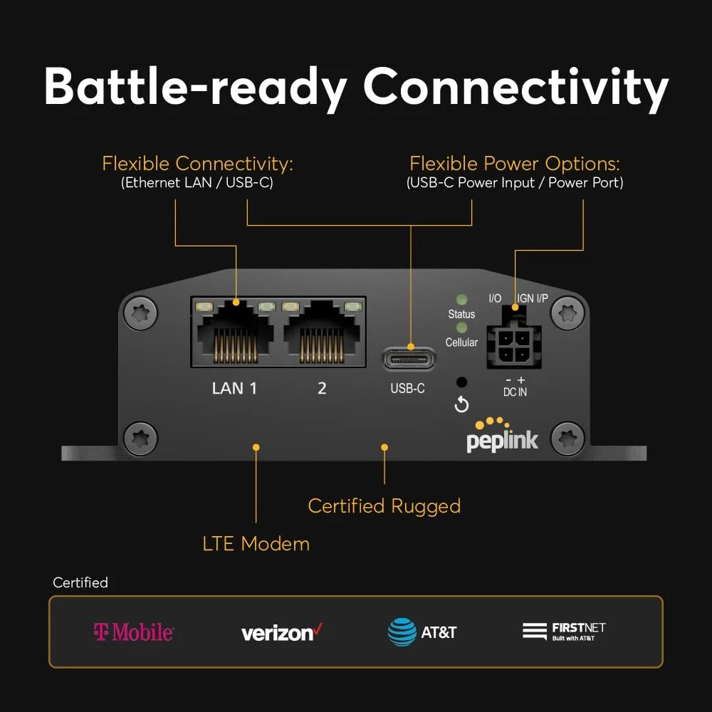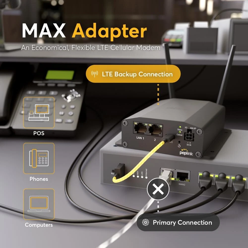 Peplink MAX Adapter LTE Cellular Modem | Rugged, Mobile, Durable 150MBps LTE Modem with SIM Card Slots and eSIM | Add Reliable LTE Cellular failover to Your Network | Ethernet, USB-C Connections Brand Peplink Item Weight 1.57 pounds Product Dimensions 5 x 4.2 x 1.4 inches Item Dimensions LxWxH 5 x 4.2 x 1.4 inches Color Black Manufacturer Peplink Country of Origin Taiwan Date First Available August 2, 2024 Brand Peplink Internet service provider T-Mobile, AT&T Wireless, Verizon Wireless, FirstNet Connectivity Technology USB, Ethernet, LAN Compatible Devices Router Product Dimensions 5"L x 4.2"W x 1.4"H ADDS RELIABLE BACKUP - Cellular LTE Modem for your network. The Peplink MAX Adapter adds cellular backup to your network, enabling more reliable Internet for your users and applications at an affordable cost. YOUR DIGITAL LIFELINE - Cellular backup means more reliable phone systems, industrial sensors, small offices, and any kind of remote terminals. For mission-critical applications, don't leave your connection to chance! TOUCHLESS SETUP - The MAX Adapter offers plug-and-play, zero touch configuration for the easiest remote deployments. Featuring built-in eSIM with included 1GB cellular data, the MAX Adapter can be configured remotely from initial power up. BATTLE-READY CONNECTIVITY - The MAX Adapter comes with LTE cellular modem (CAT 4 - 150MBps down / 50MBps up), Ethernet and USB-C ports and flexible powering options that work in both office and field-deployed locations. CARRIER CERTIFIED - Add cellular connectivity to any of the major US carriers. Certified for operation on AT&T, Verizon, T-Mobile and the FirstNet networks. Provide your own SIM, eSIM or take advantage of Peplink's multi-carrier data plans. Peplink Max Adapter LTE Cellular Modem Shipping We offer FREE shipping on all orders! We ship within Three business days of payment, usually sooner. We use a selection of shipping services such as UPS, FedEx, USPS etc. We only ship to the lower 48 states, no APO/FPO addresses or PO Boxes allowed. Local pickups and combined shipping options are not provided at this time. Return You can return a product for up to 30 days from the date you purchased it. Any product you return must be in the same condition you received it and in the original packaging. Please keep the receipt. Payment We accept payment by any of the following methods: PayPal Please pay as soon as possible after winning an auction, as that will allow us to post your item to you sooner! Feedback Customer satisfaction is very important to us. If you have any problem with your order, please contact us and we will do our best to make you satisfied. Contact Us If you have any queries, please contact us via ebay. We usually respond within 24 hours on weekdays. Please visit our eBay store to check out other items for sale! Thank you for shopping at our store.