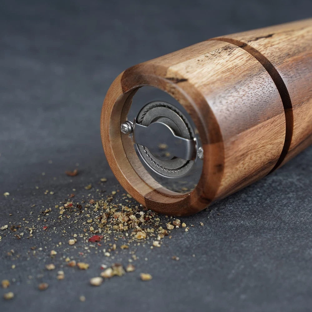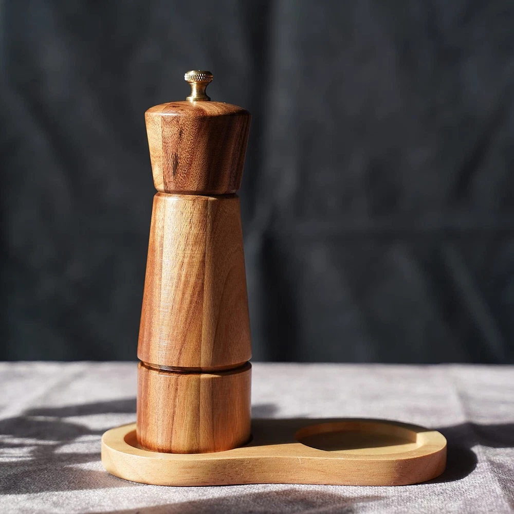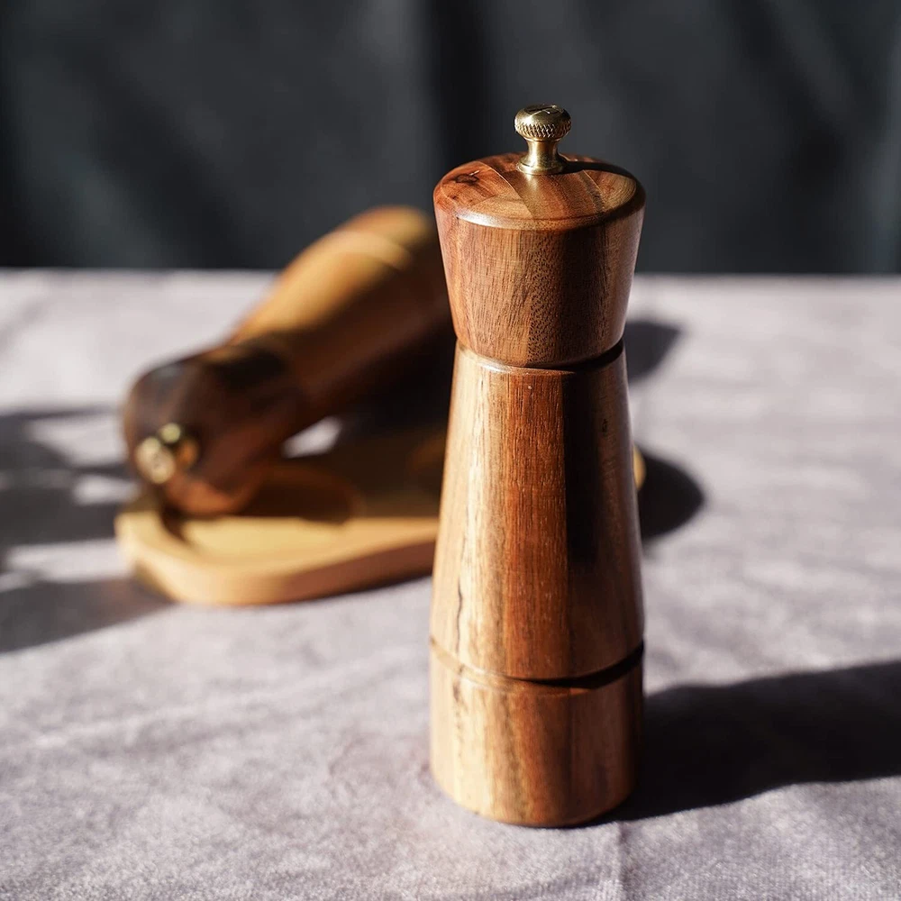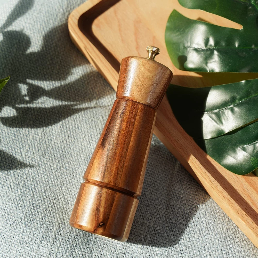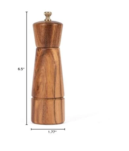 Pepper grinder makings: solid acacia wood bottle, copper nut, stainless steel grinding mechanism, rotation shaft and bottom plate. Height: 16.5 cm, bottom DIA: 5 cm, upper DIA: 4.5 cm. Pepper grinder blended with sturdy and beautiful rubberized wood grain. That adds a strong presence to the tabletop, kitchen or counter. Excellent for grinding peppercorns. Resistant, anti-rust and sharp stainless steel mechanism ensures fresh flavor and memorable texture. You can adjust it by tightening or loosening the copper knob to grind out different particles, from fine to coarse, depending on what you need. A portable, practical and manually operated pepper grinder mill is excellent helper for picnic, dinner, parties, kitchen, barbecue, and restaurant to use.