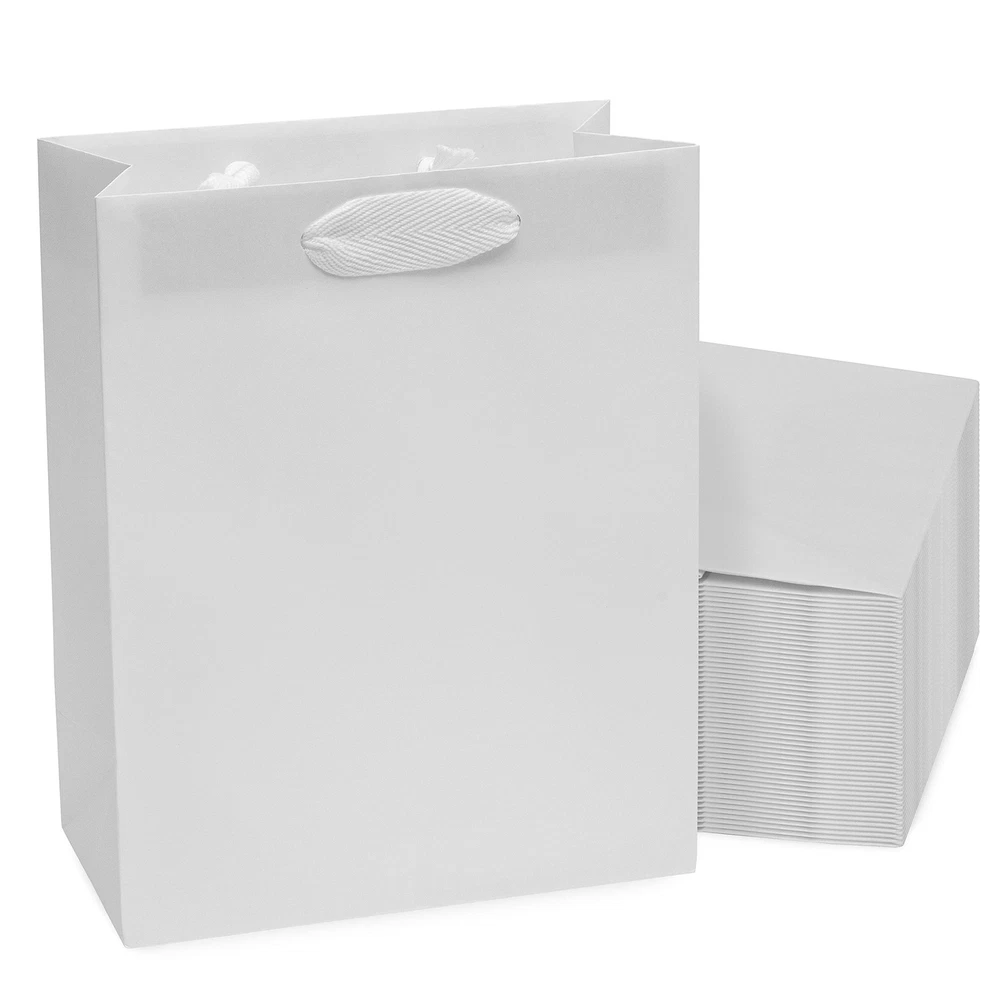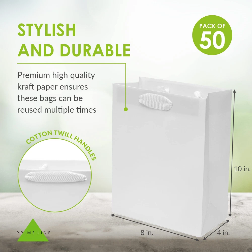 Our trendy 100% premium kraft paper matte white gift bags elevate any gift or item you bring to various events such as birthdays, weddings, bachelorette parties, holiday parties, dinner parties, and even professional events. Made from high-quality and durable kraft paper, these white gift bags measure 8x4x10 inches. They are perfect for wrapping gifts like jewelry, books, picture frames, and more. These matte white gift bags also include woven fabric handles that make it easy and comfortable to carry your gift wherever you go. These matte white gift bags come in a pack of 50, so you’re never left without a stylish and trendy paper gift bag. Made from 80% post-consumer waste, these bags can be recycled and composted, making them a great eco-friendly option for your party, event, or business. PERFECT FOR ALL OCCASIONS - Whether you’re attending a baby shower, birthday party, holiday party, or dinner party, these white kraft paper gift bags are suited for every occasion PERSONALIZE AND DECORATE - Make these white kraft paper gift bags your own by adding personalized designs with stencils, stamps, or markers STAND OUT FOR SPECIAL OCCASIONS - These white paper gift bags are perfect for weddings, bridal showers, Easter, First Holy Communion, and professional events MULTIPLE USES - Measuring 8x4x10 inches, these gift bags are extremely versatile - use them for party favors, gifts, merchandise bags, and more WRAP MEDIUM-SIZED GIFTS EASILY - These durable premium white kraft paper gift bags can hold small and medium-sized items like books, frames, and more making it easy to wrap gifts for your loved ones