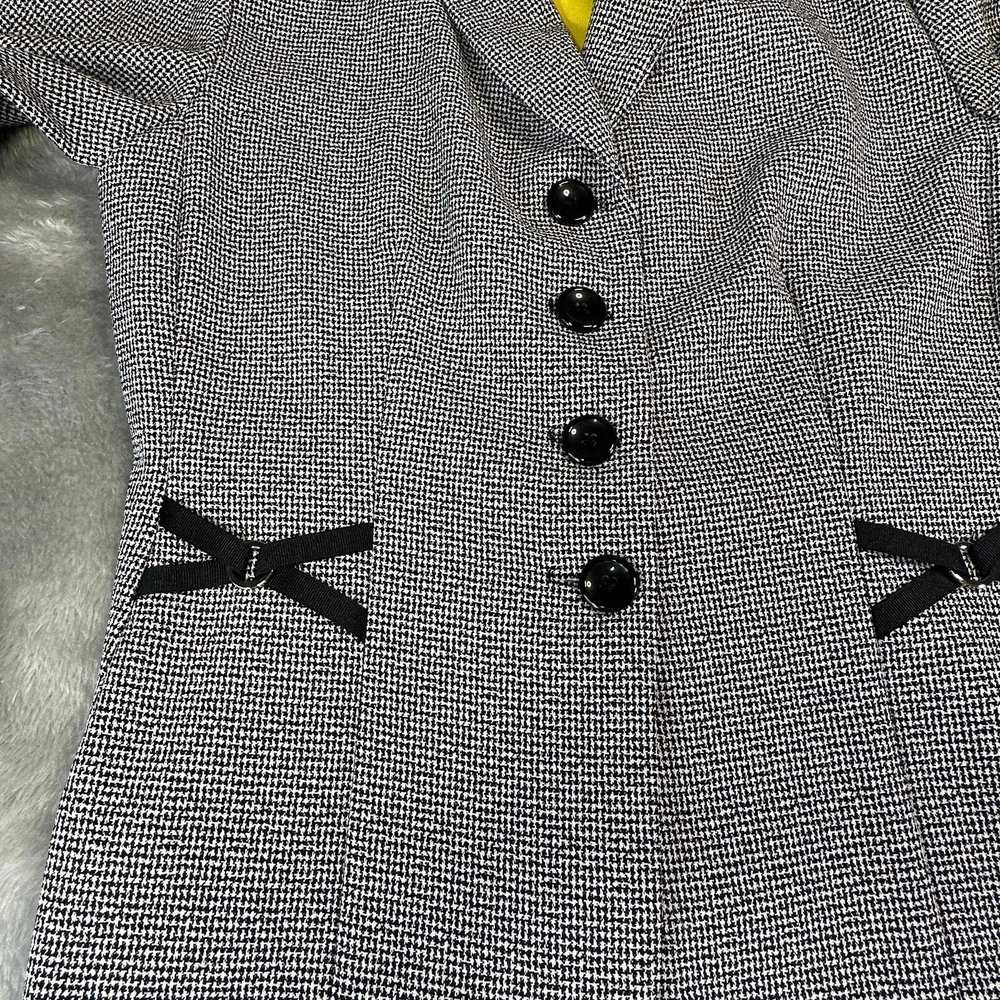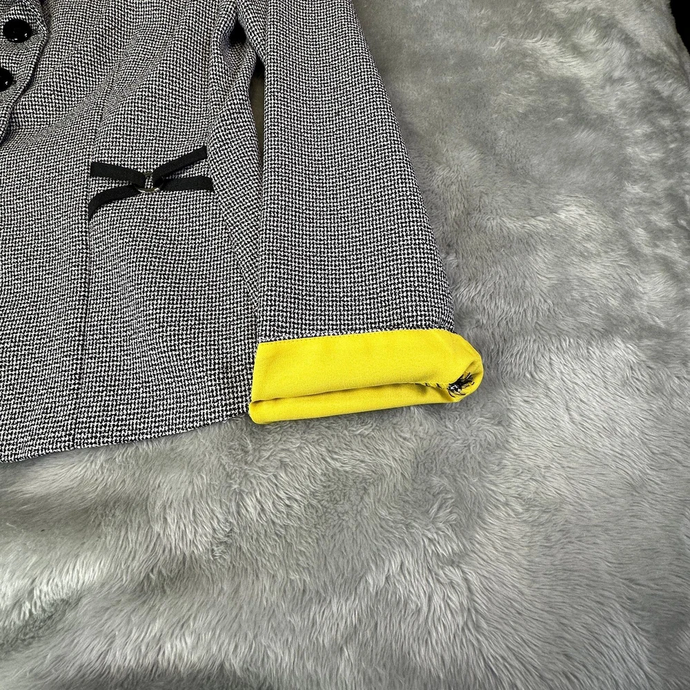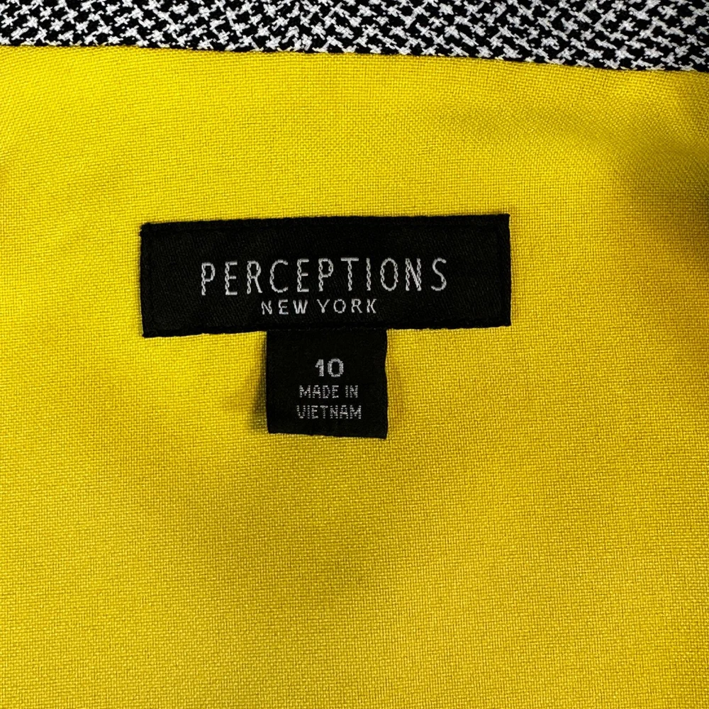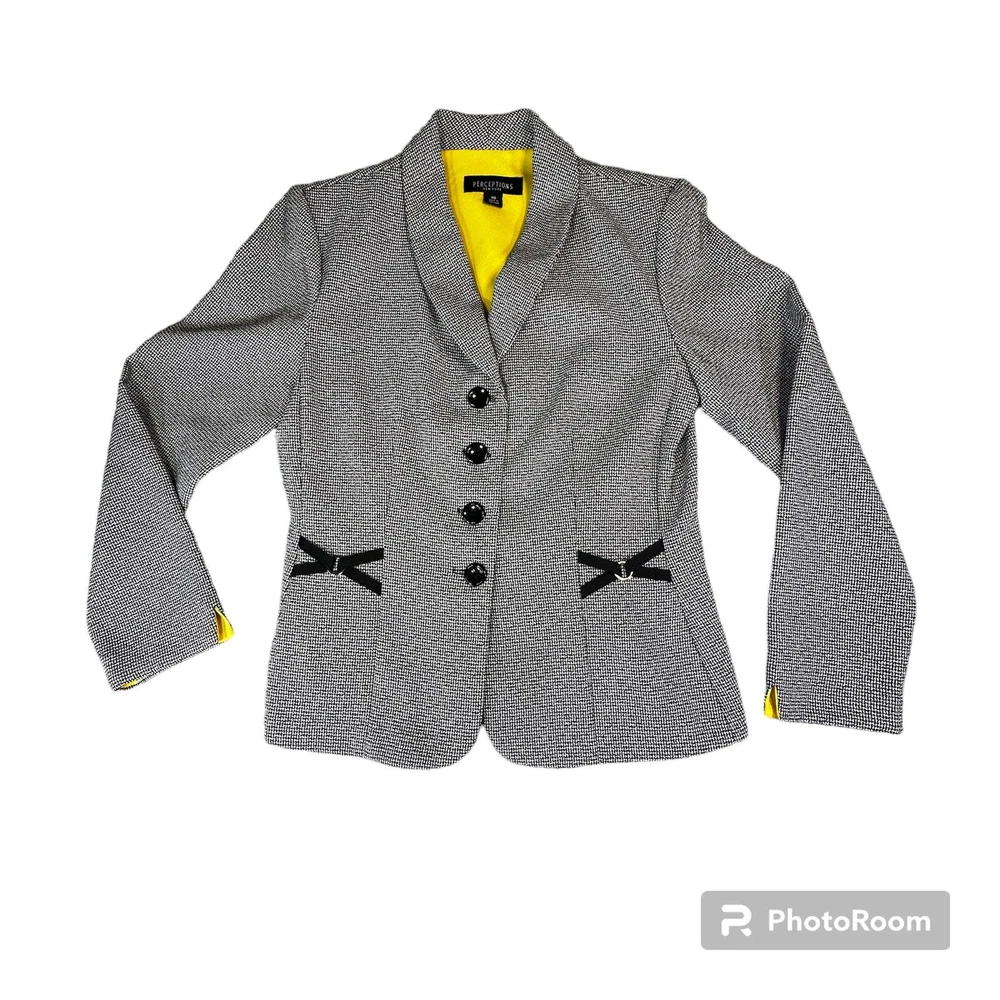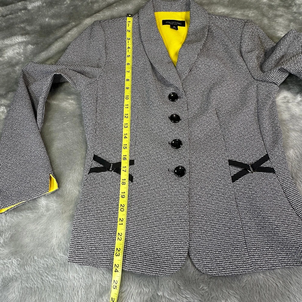 Perceptions Women's Size 10 Black White Long Sleeve Button Front Blazer Jacket Gender: Womens Size: 10 Brand: Perceptions Color: Black and White with Yellow accent Long Sleeves 4 Button Front V-Neck Collared Decorative X's on Front and Back Yellow Accent on Neck and Cuffs 100% Polyester Machine Washable Made in Vietnam Approximate Measurements Not Exact: Underarm to Underarm Approx. - 18” Length Approx. - 24" Pre-Owned in Excellent Condition (EUC) *Colors may vary depending on lighting and individual viewing devices Offers Welcomed Bundle Discounts Available Fast Shipping 5 Star Seller Thank you for shopping my closet! Location 19 - 0007 Professional, Business, WorkWear, Office Wear, Jacket, Blazer, Coat, Lightweight, Sophisticated, Suit, CorpCore, Classic, ClassicCore, Basic, Mature, Sophisticated